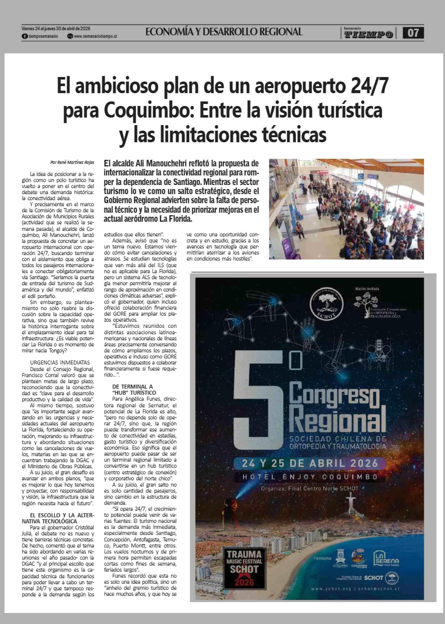 El ambicioso plan de un aeropuerto 24/7 para Coquimbo: Entre la visión turística y las limitaciones técnicas 24-04-2026 Semanario Tiempo |