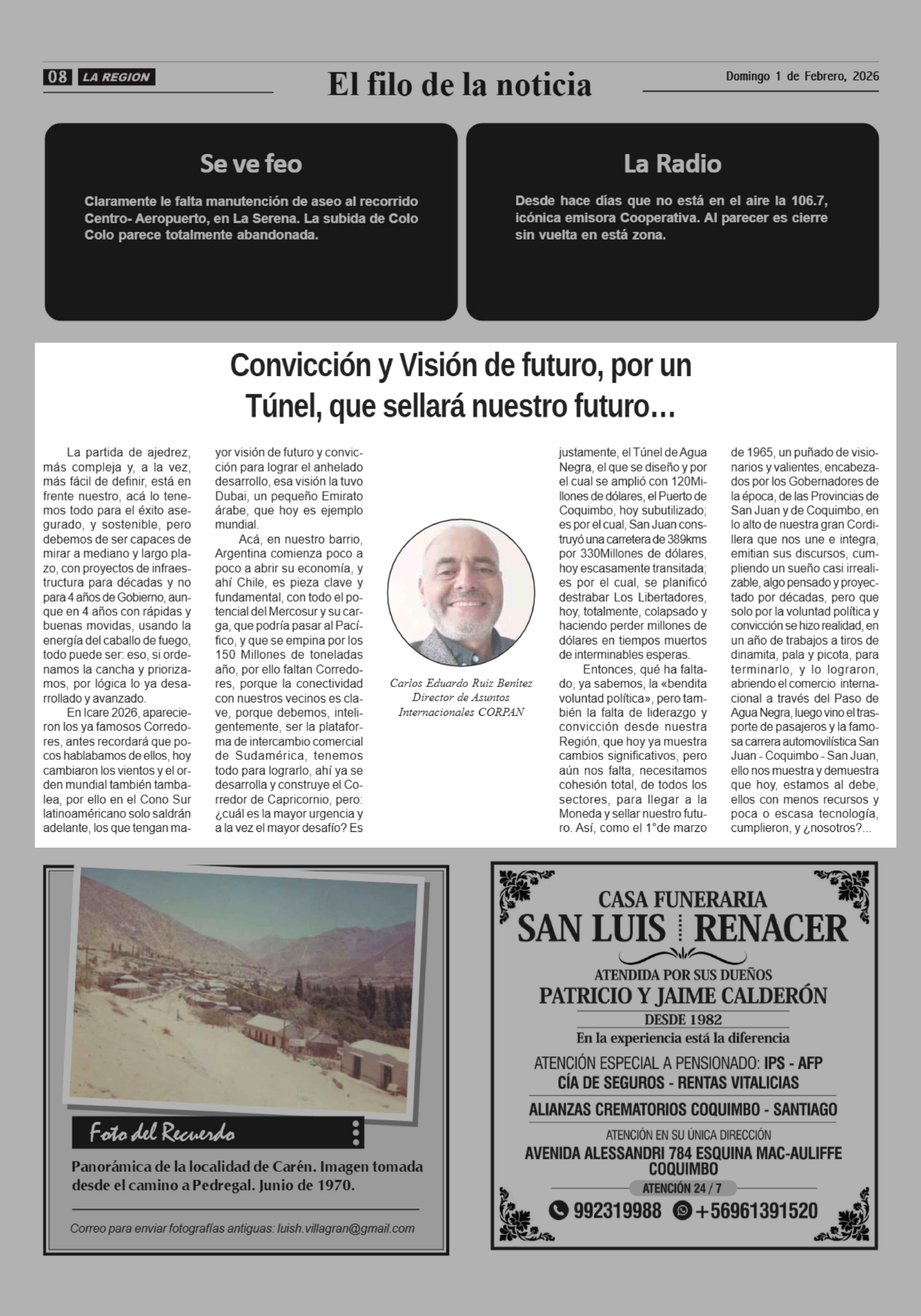 Columnas de Opinión: Convicción y Visión de futuro, por un Túnel, que sellará nuestro futuro ... 01-02-2026 Diario la Región |