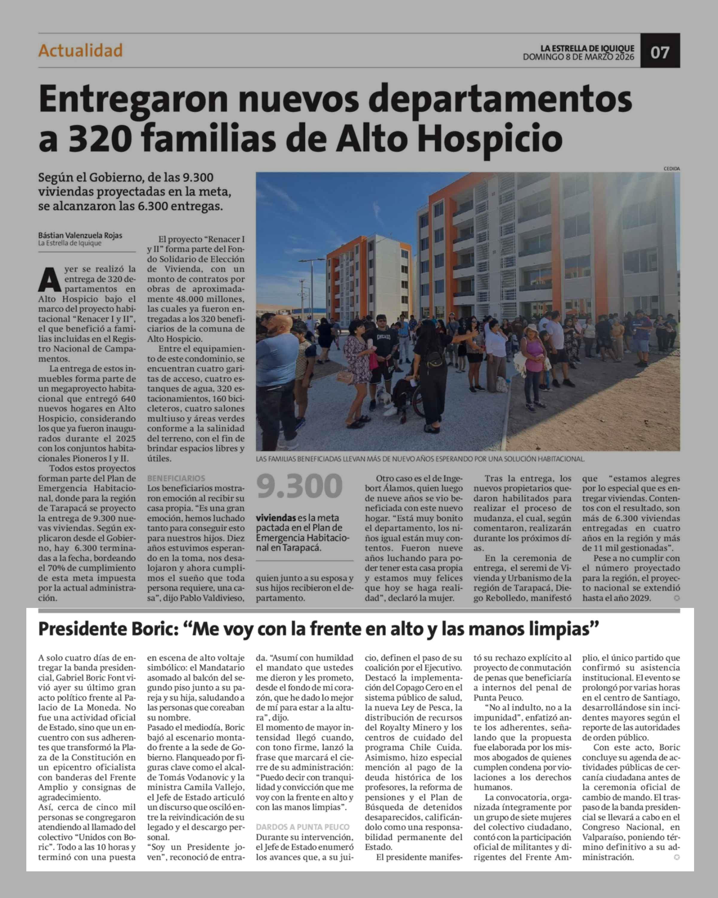 Presidente Boric: "Me voy con la frente en alto y las manos limpias" 08-03-2026 La Estrella de Iquique |