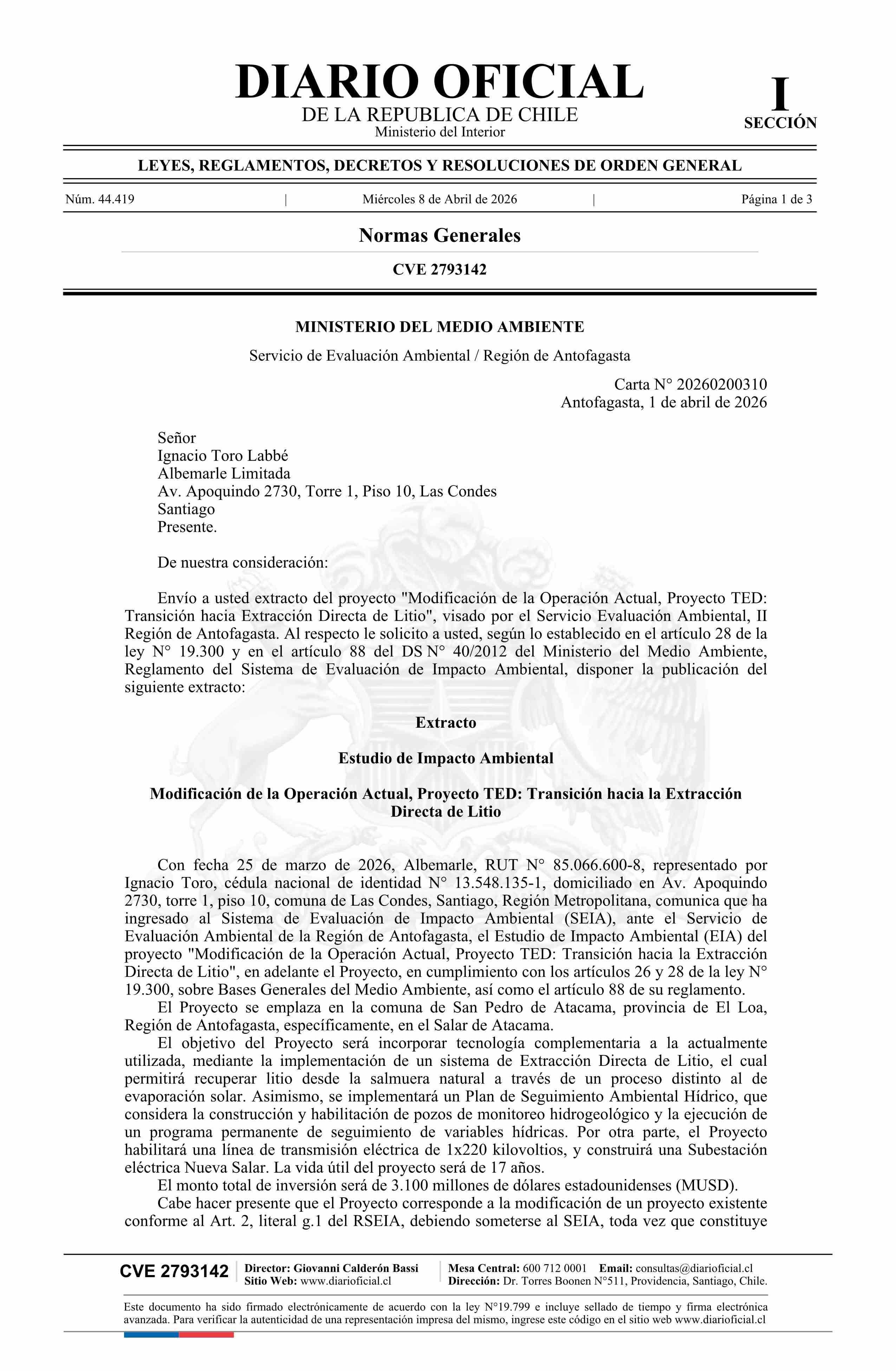 Extracto de Estudio de Impacto Ambiental Modificación de la Operación Actual, Proyecto TED: Transición hacia la Extracción Directa de Litio 08-04-2026 Diario Oficial Edición Electrónica |