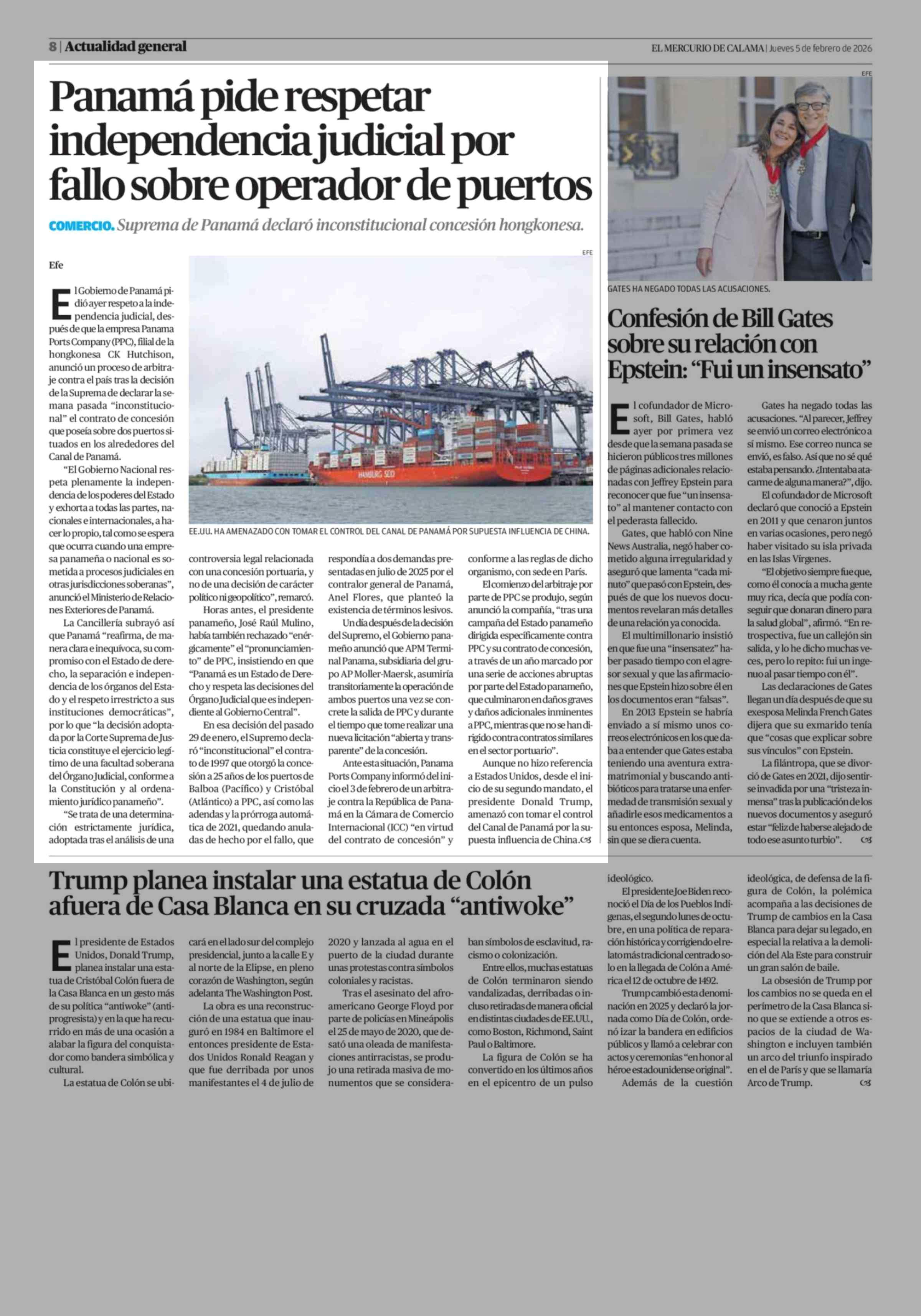 Panamá pide respetar independencia judicial por fallo sobre operador de puertos 05-02-2026 El Mercurio de Calama |