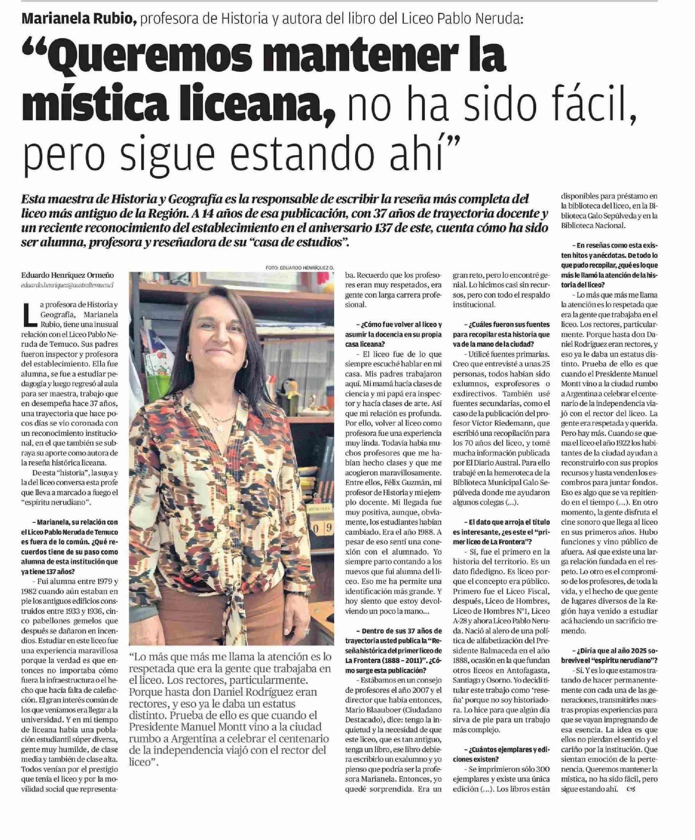 “Queremos mantener la mística liceana, no ha sido fácil, pero sigue estando ah” 13-04-2025 El Austral de la Araucanía |