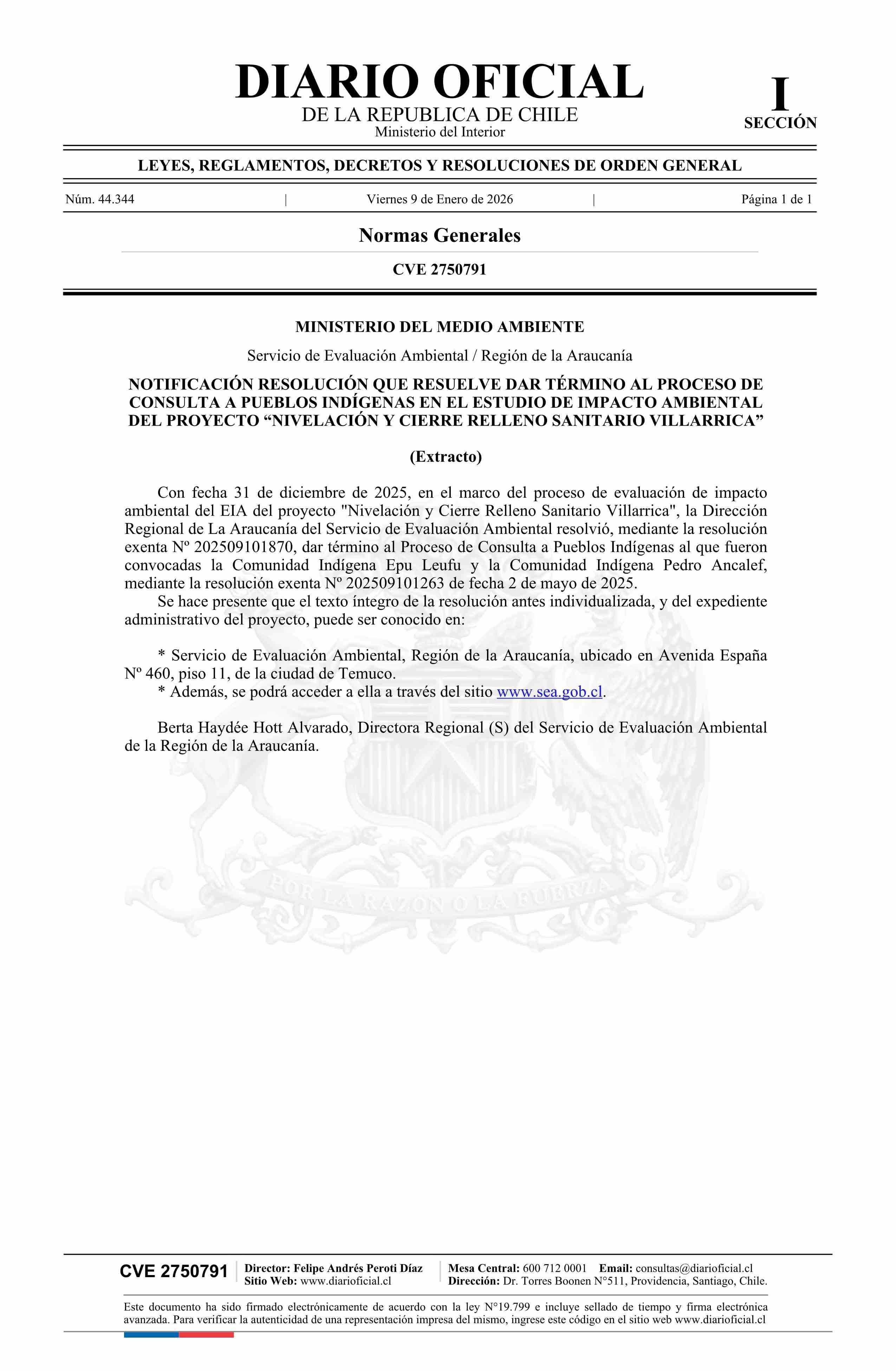 Título: Extracto de resolución exenta número 202509101870, de 2025.- Da término al proceso de consulta a pueblos indígenas en el Estudio de Impacto Ambiental del proyecto Nivelación y Cierre Relleno Sanitario Villarrica