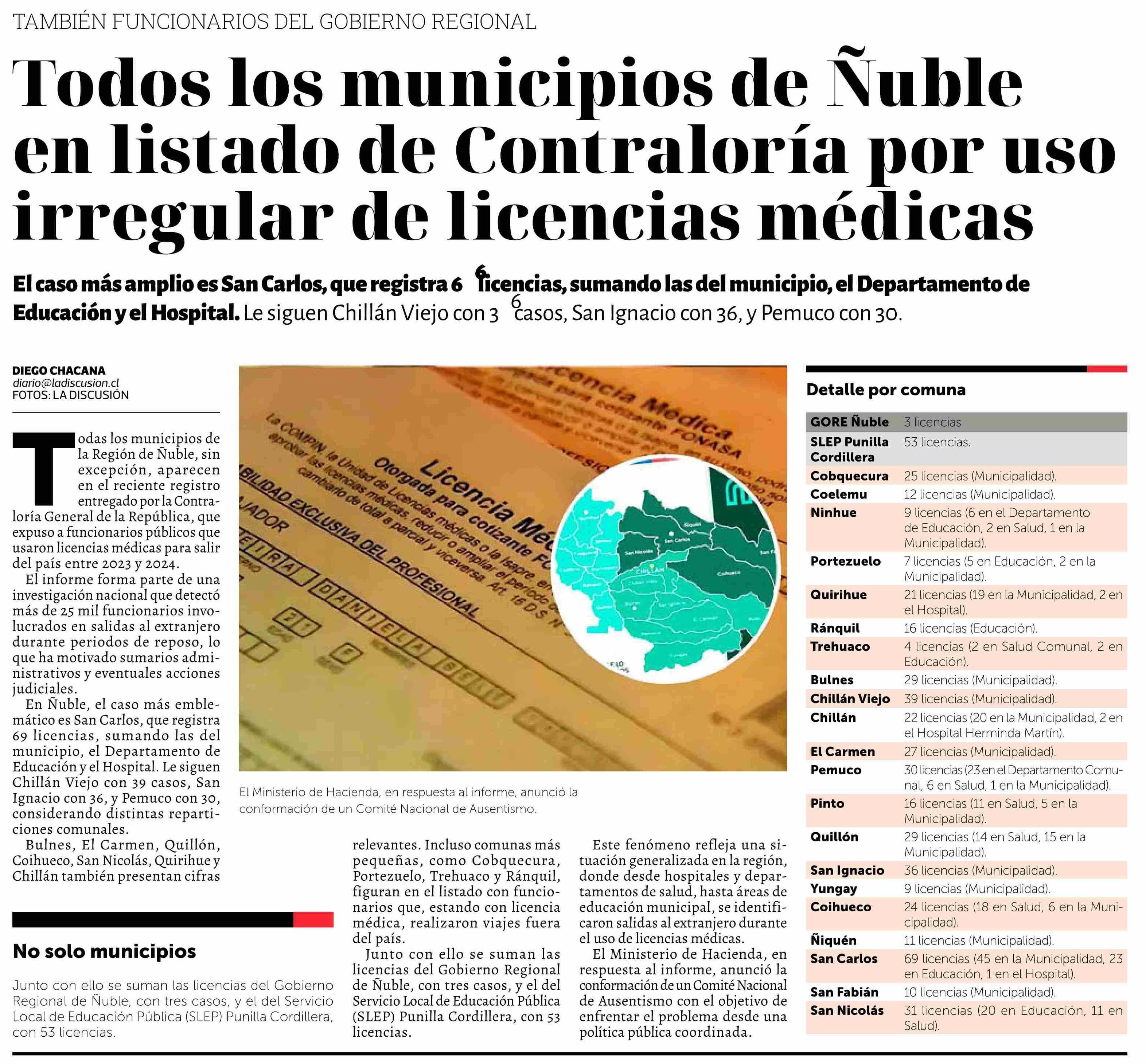 Todos los municipios de Ñuble en listado de Contraloría por uso irregular de licencias médicas 24-05-2025 La Discusión |