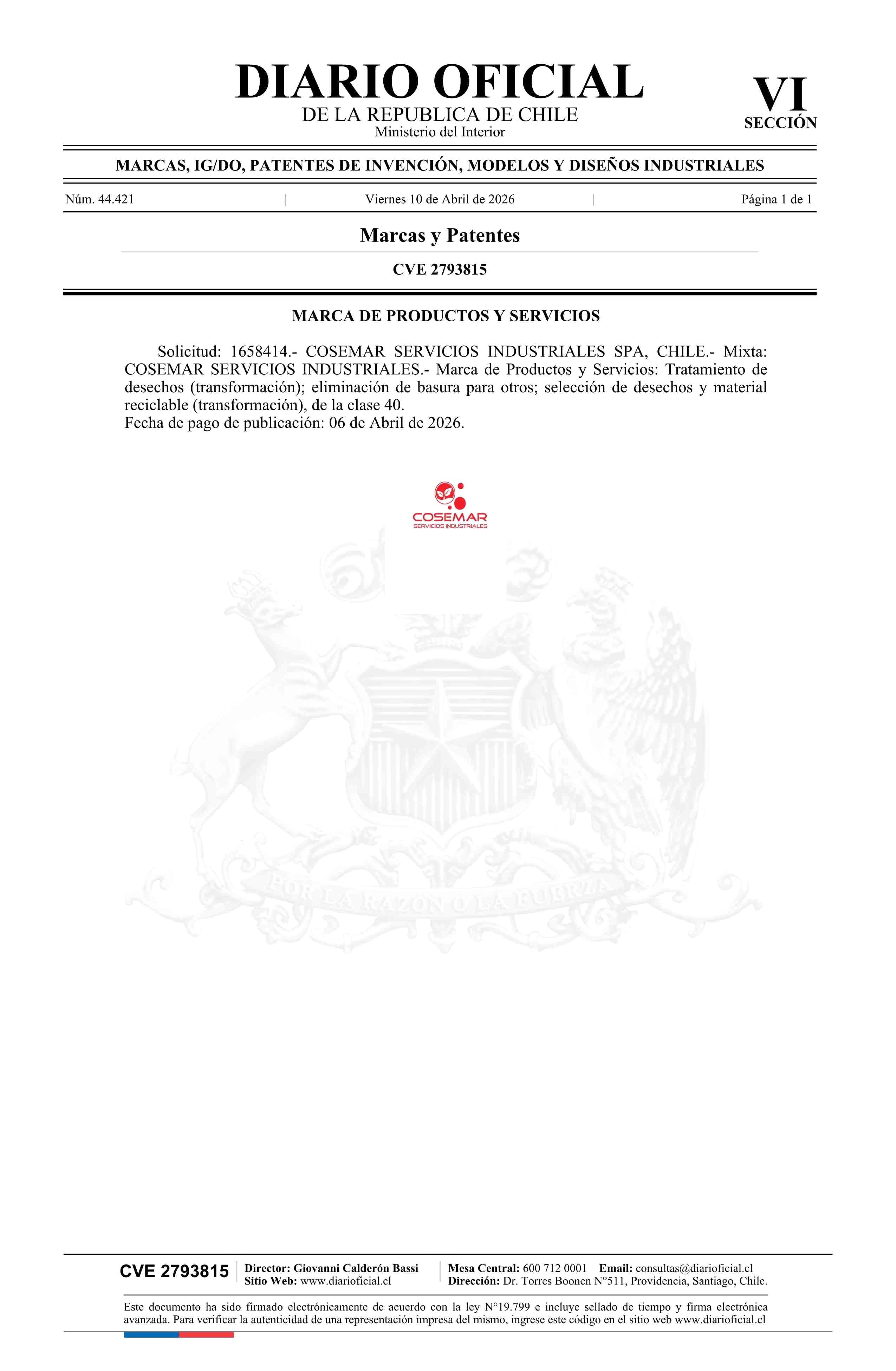 Solicitud número 1658414.- COSEMAR SERVICIOS INDUSTRIALES 10-04-2026 Diario Oficial Edición Electrónica |