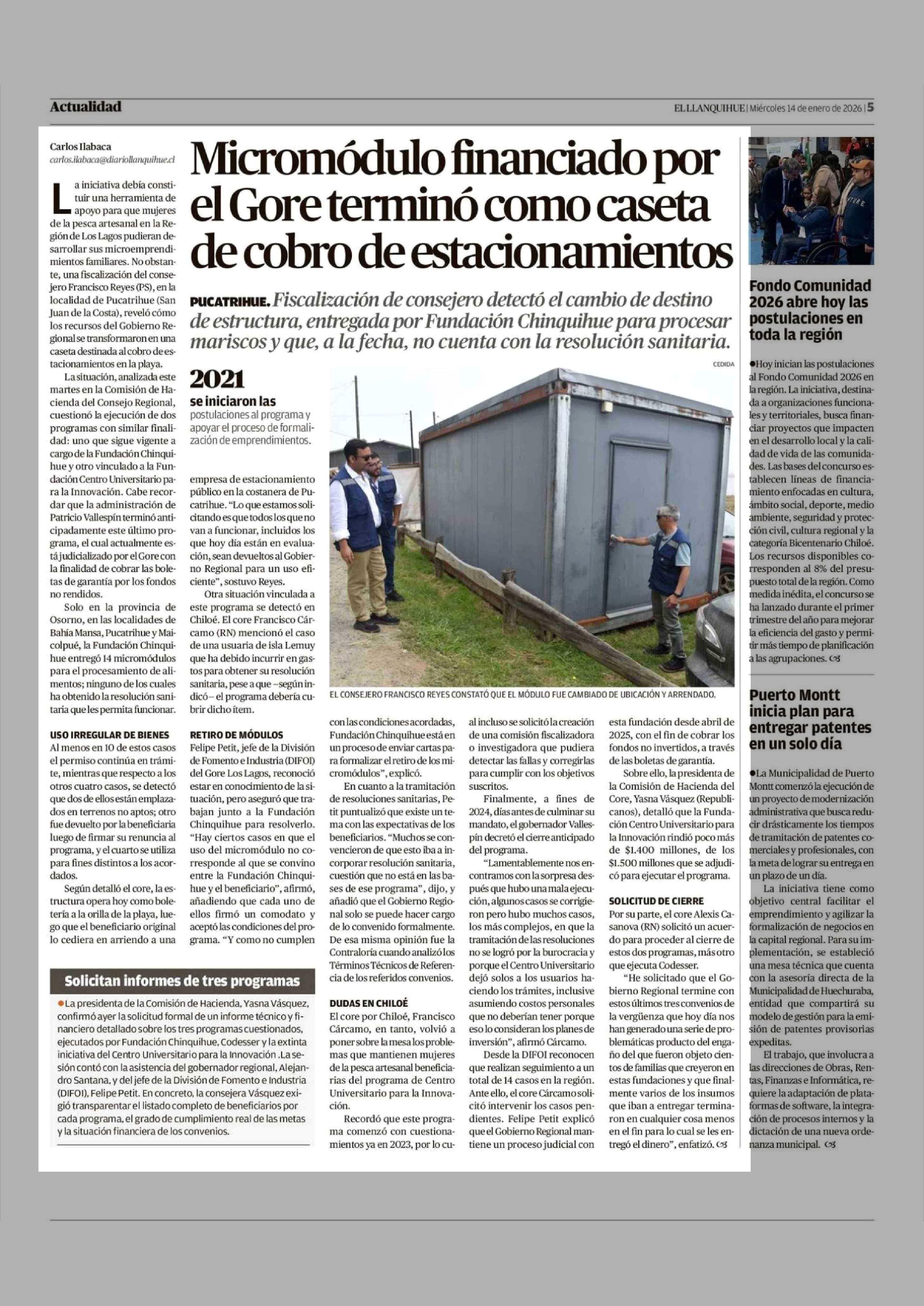 Micromódulo financiado por el Gore terminó como caseta de cobro de estacionamientos 14-01-2026 El Llanquihue |