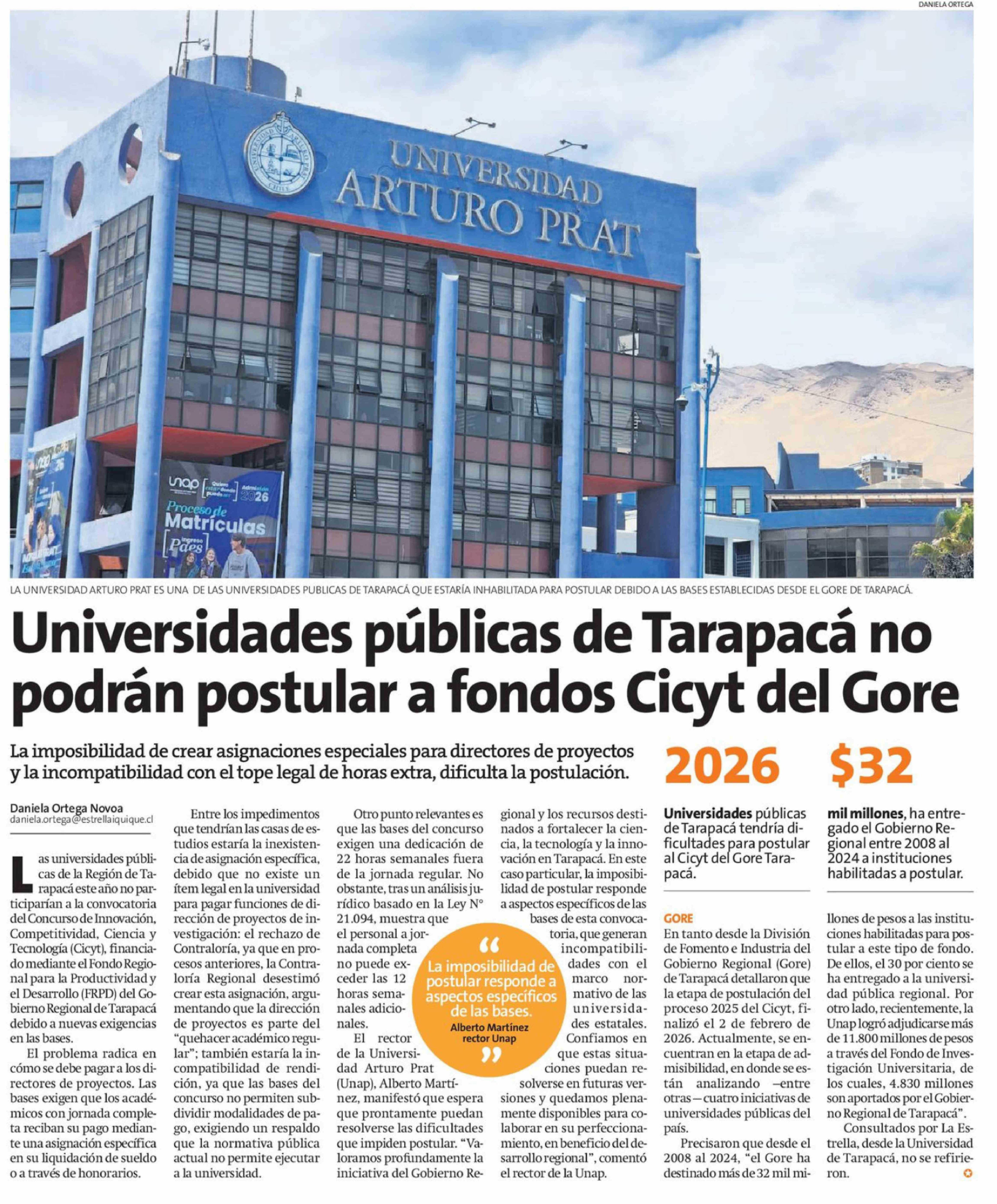 Universidades públicas de Tarapacá no podrán postular a fondos Cicyt del Gore 11-02-2026 La Estrella de Iquique |