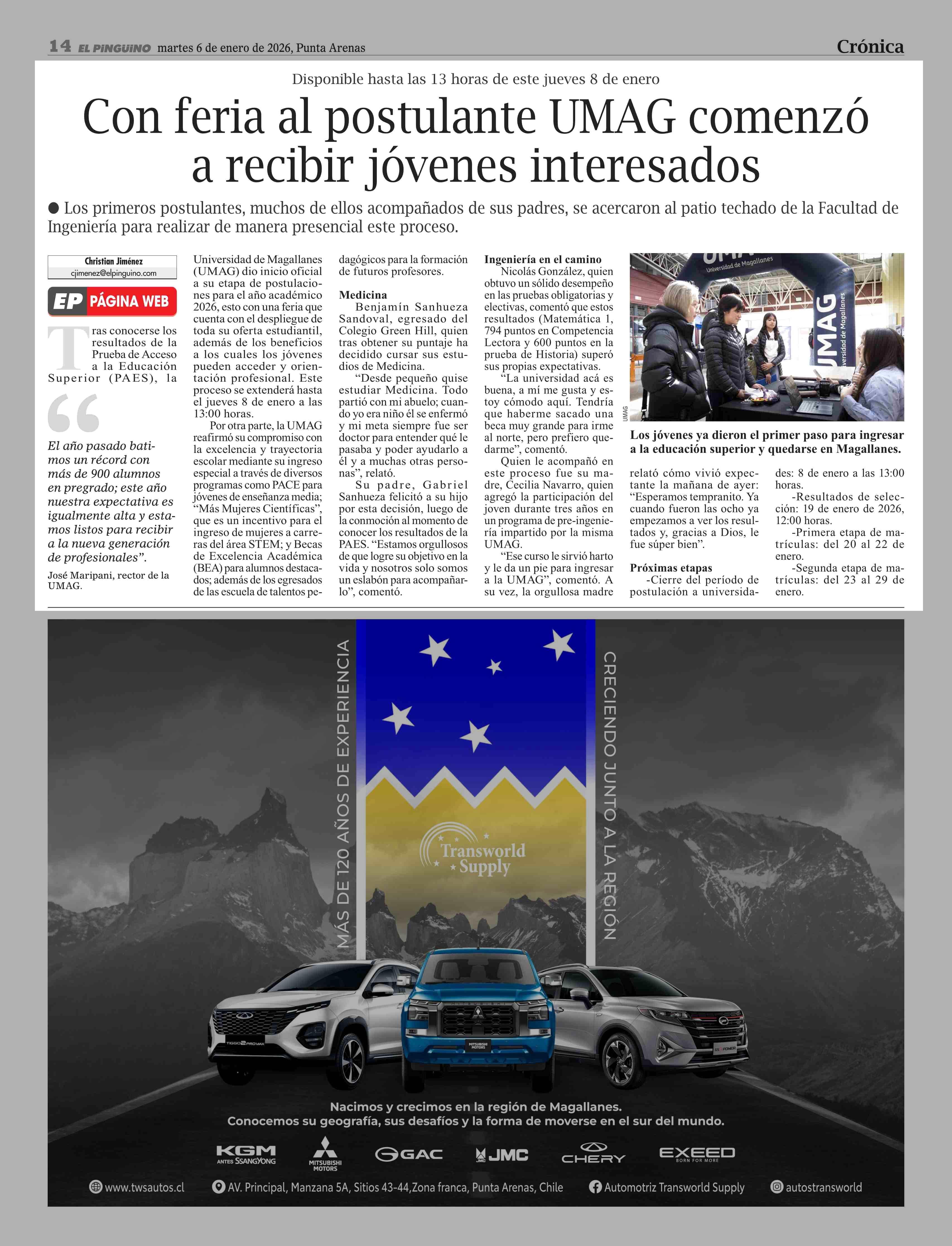 Con feria al postulante UMAG comenzó a recibir jóvenes interesados 06-01-2026 El Pingüino |