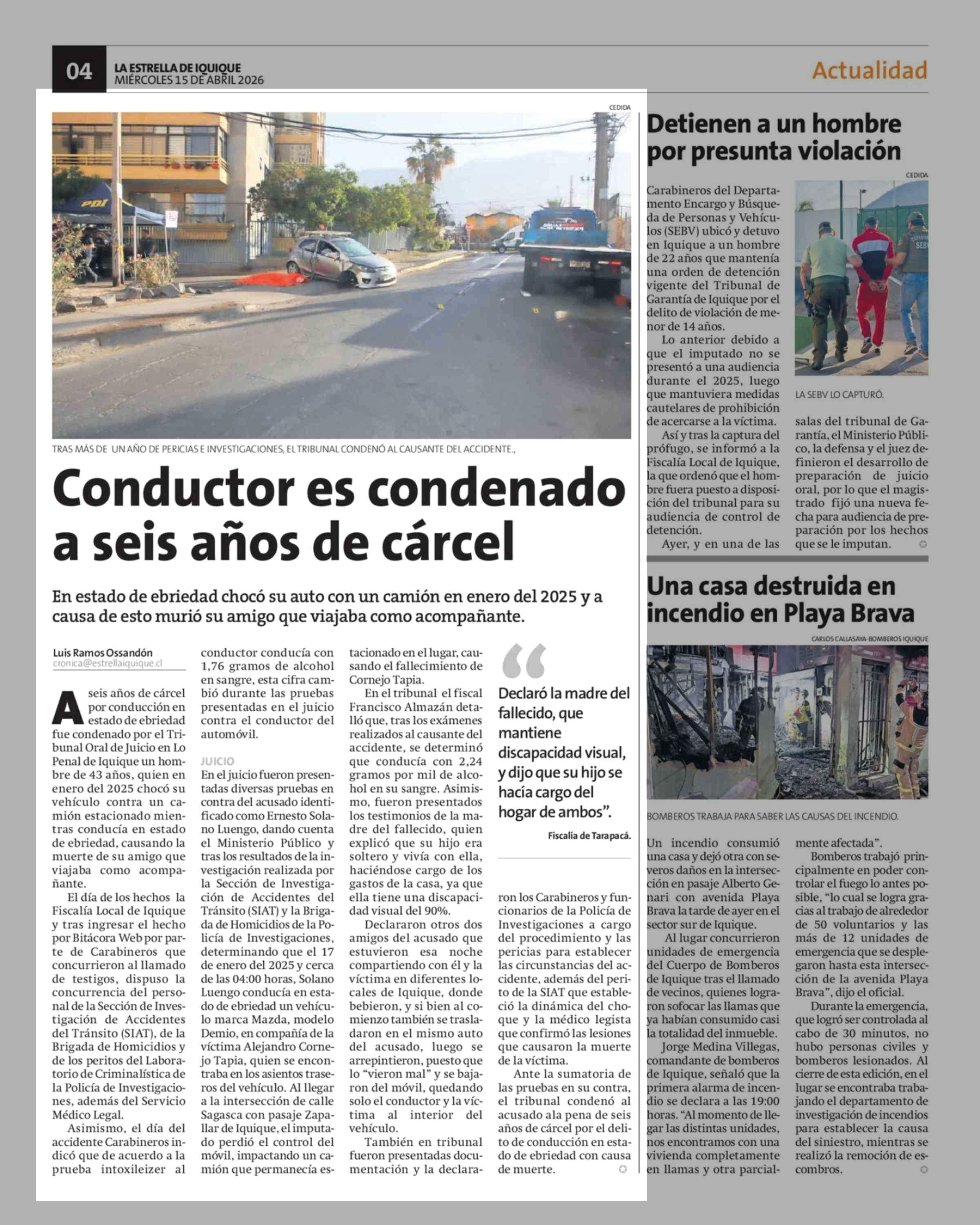 Conductor es condenado a seis años de cárcel 15-04-2026 La Estrella de Iquique |