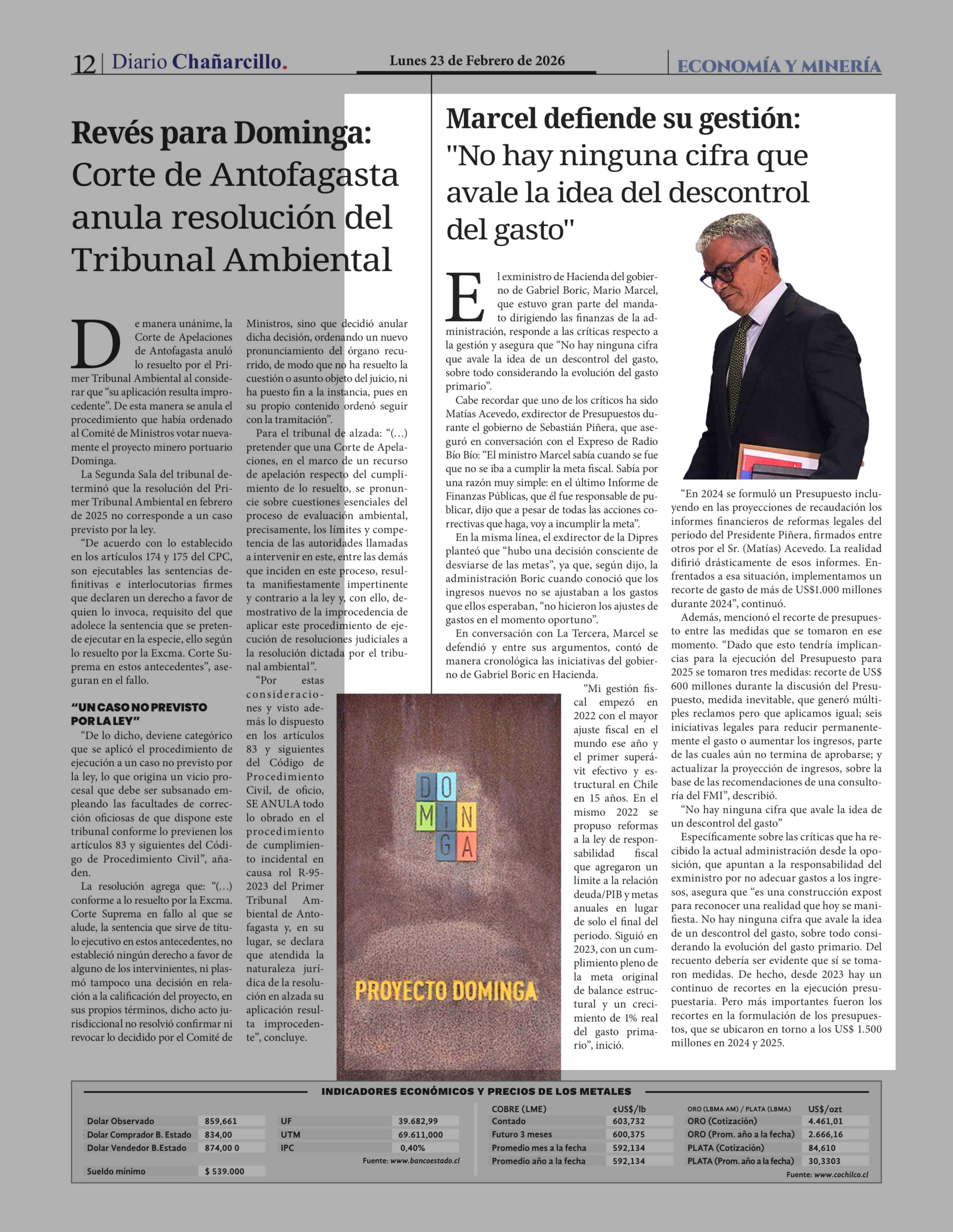 Marcel defiende su gestión: "No hay ninguna cifra que avale la idea del descontrol del gasto" 23-02-2026 Diario Chañarcillo |
