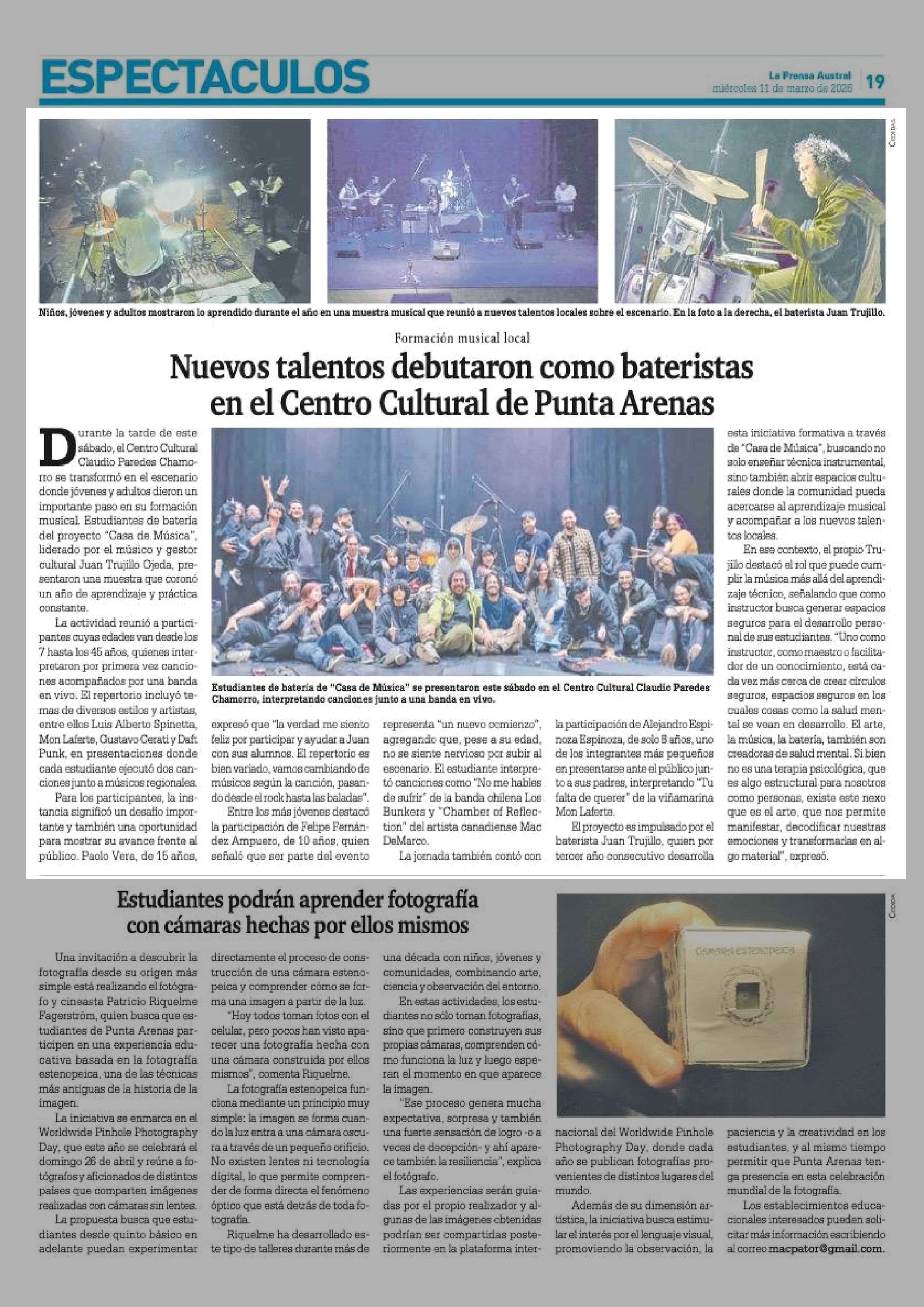 Título: Nuevos talentos debutaron como bateristas en el Centro Cultural de Punta Arenas