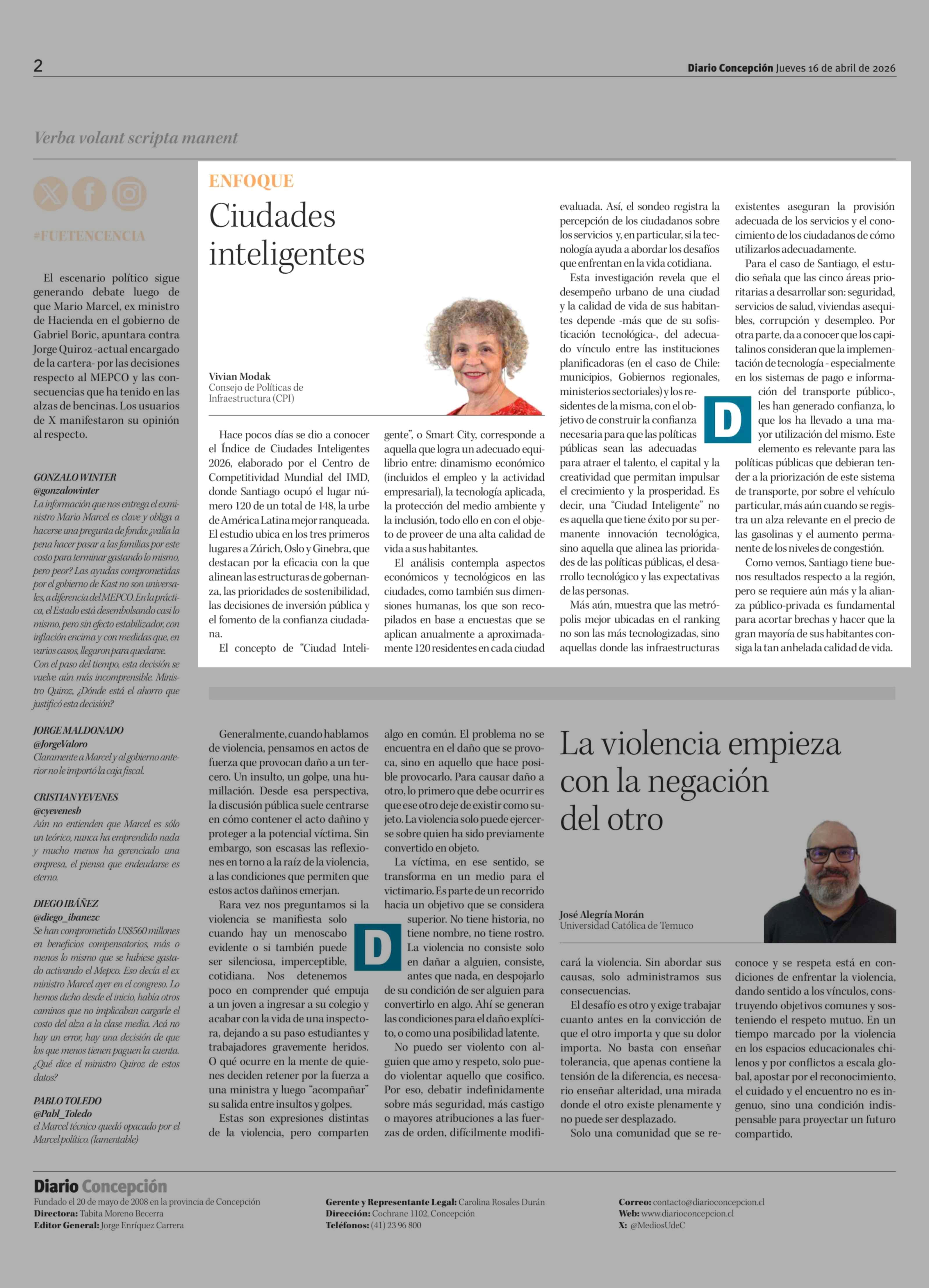 Columnas de Opinión: Ciudades inteligentes 16-04-2026 Diario Concepción |