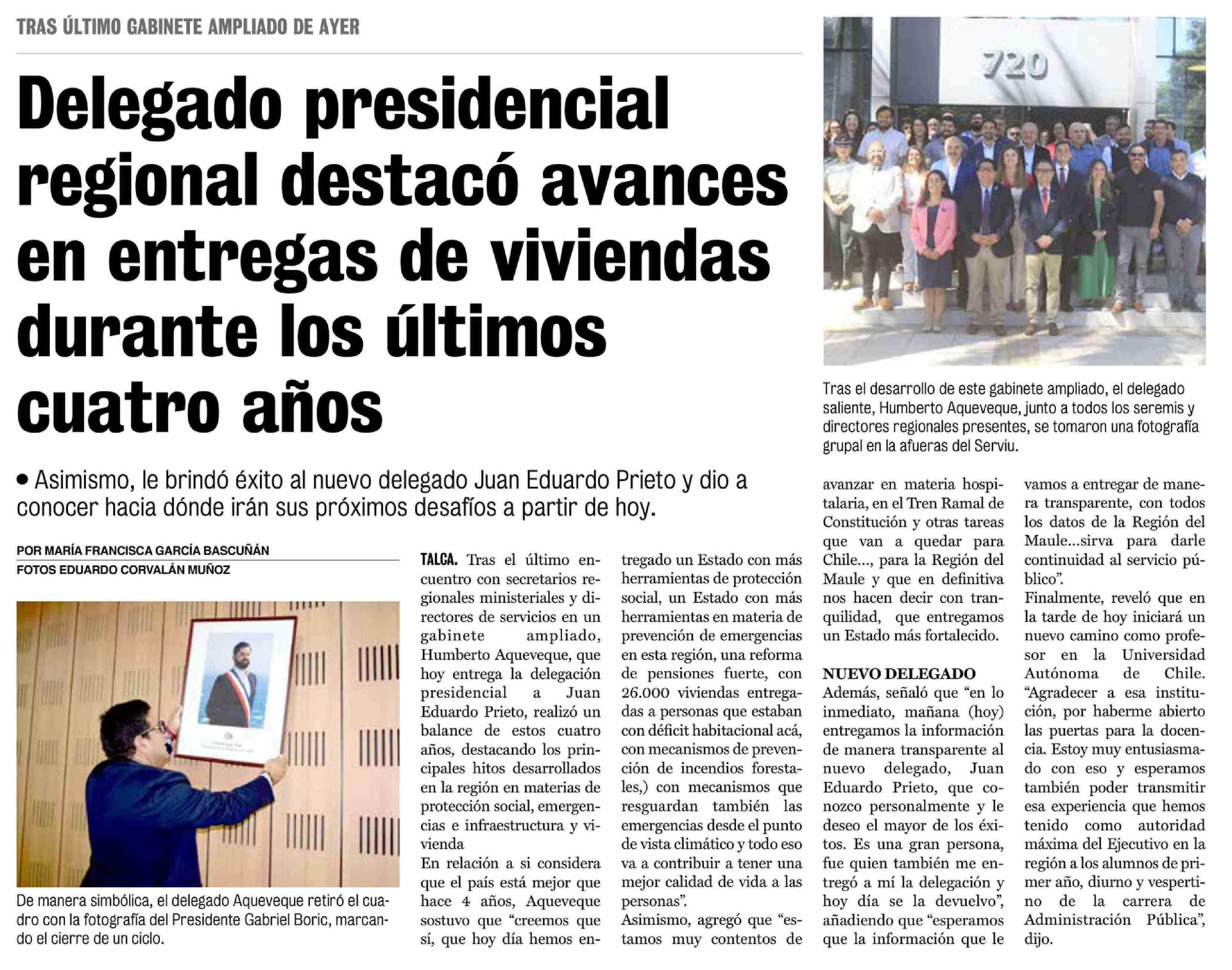 Delegado presidencial regional destacó avances en entregas de viviendas durante los últimos cuatro años 11-03-2026 La Prensa de Curicó |