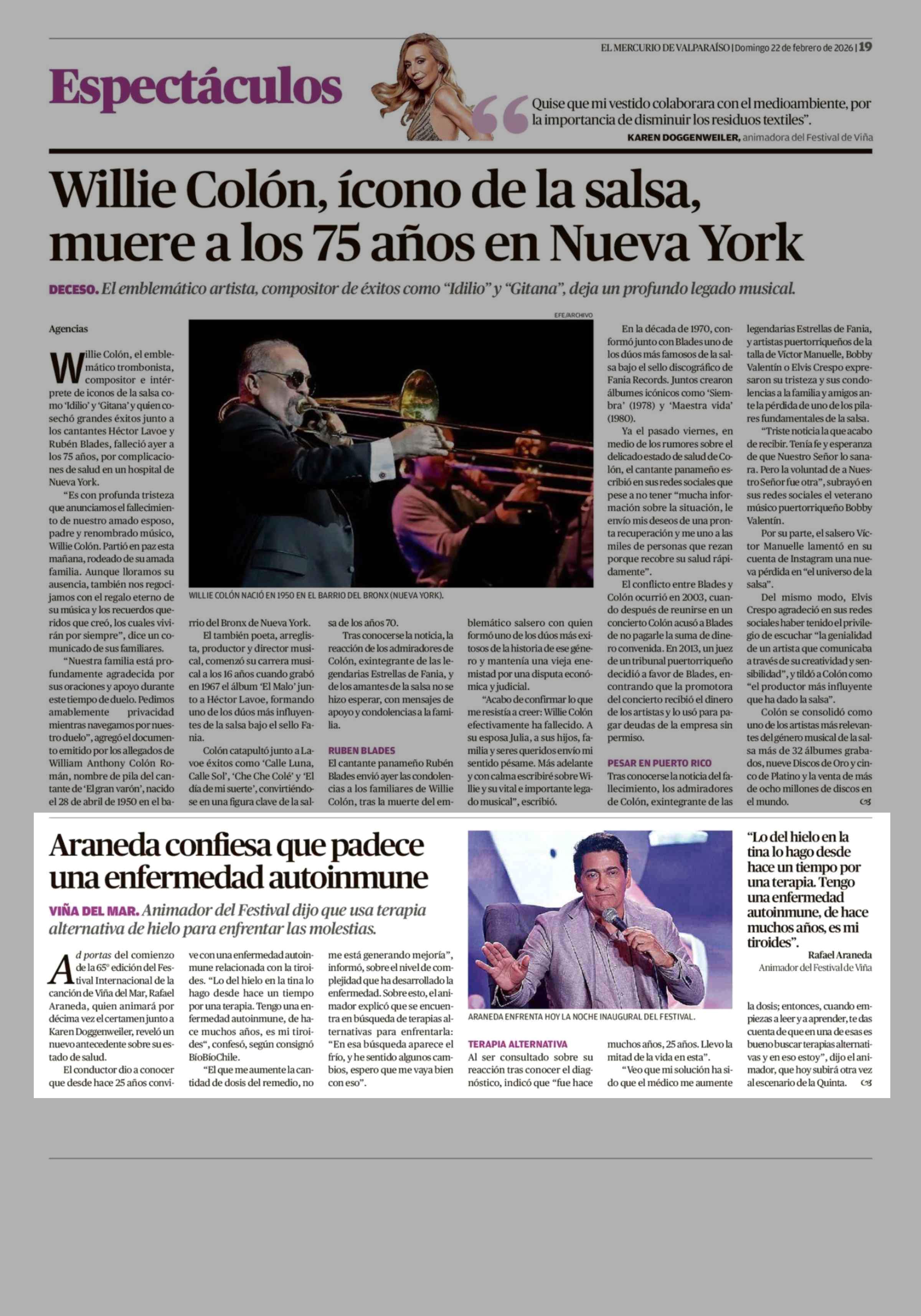 Araneda confiesa que padece una enfermedad autoinmune 22-02-2026 El Mercurio de Valparaíso |