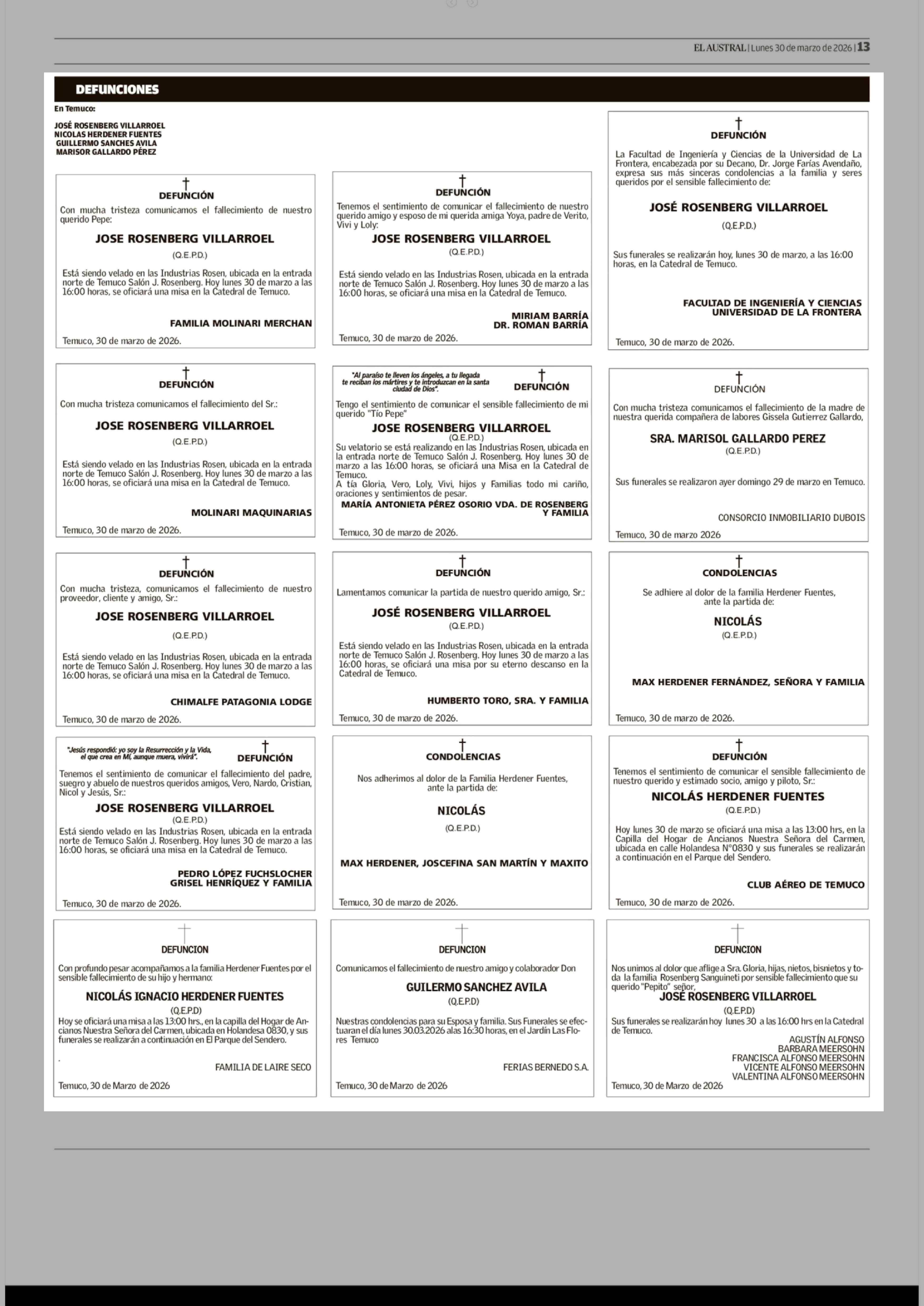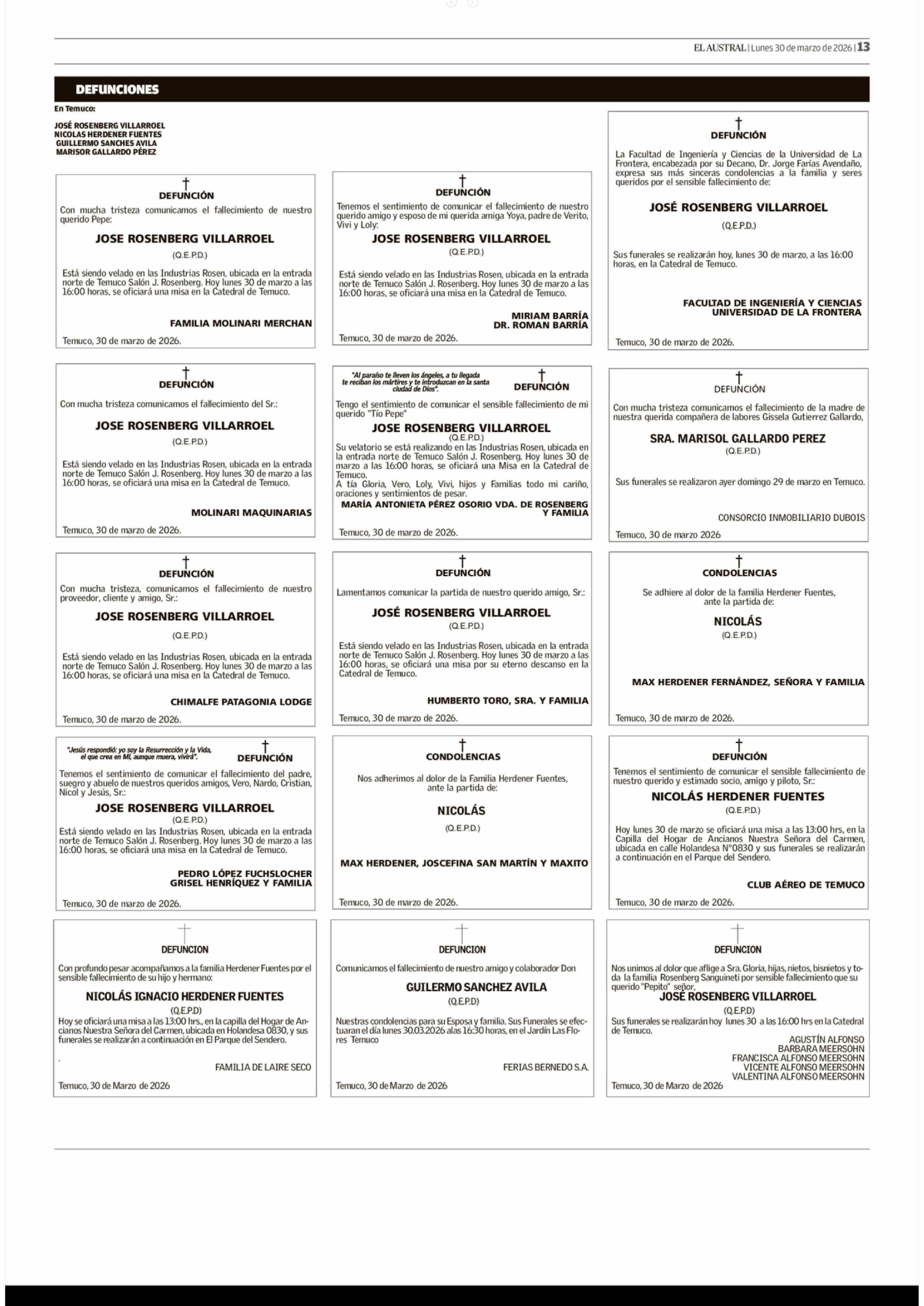 Fecha: 30-03-2026 Sector: Obituario Región: Región de la Araucanía