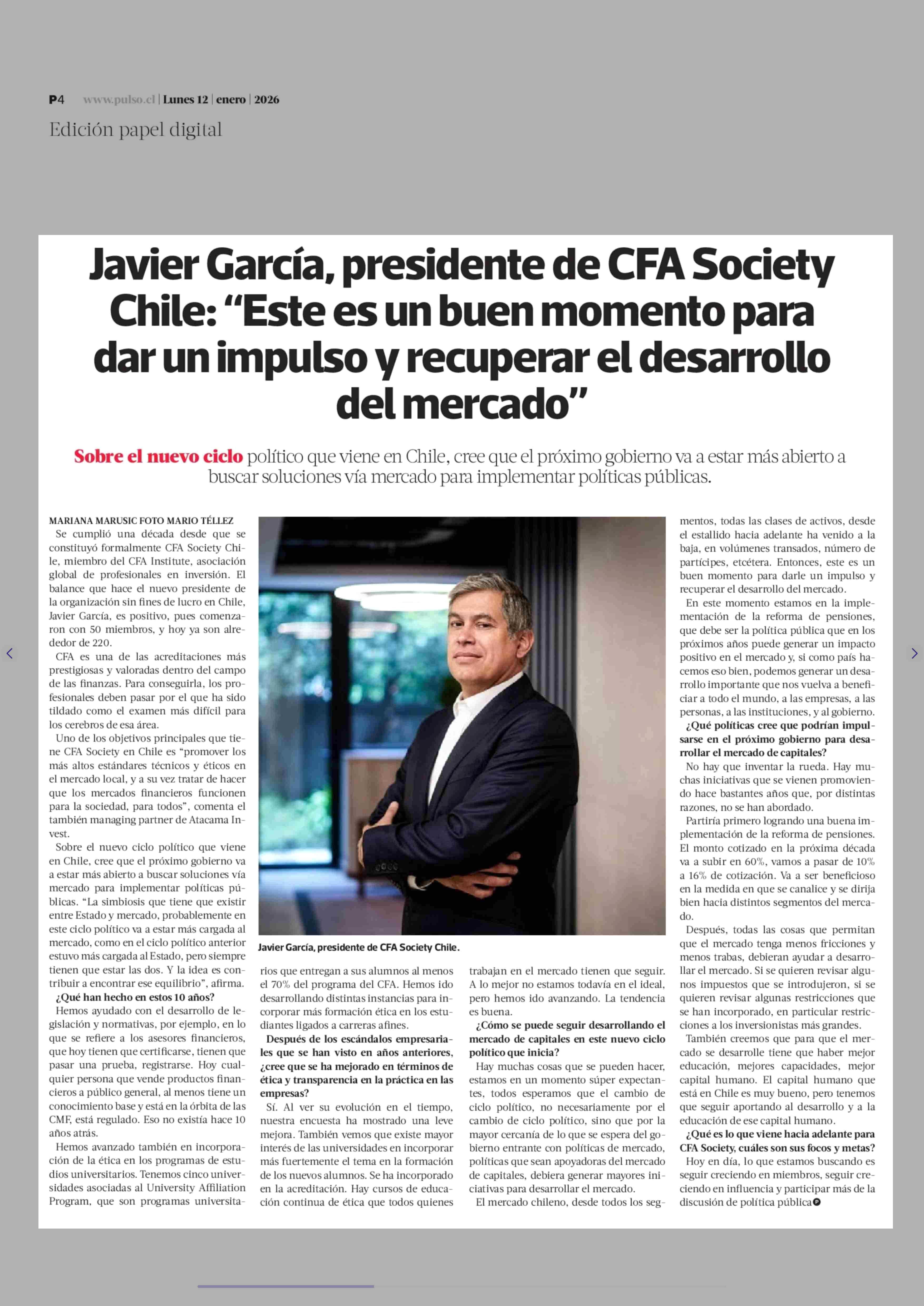 Título: Javier García, presidente de CFA Society Chile: "Este es un buen momento para dar un impulso y recuperar el desarrollo del mercado"