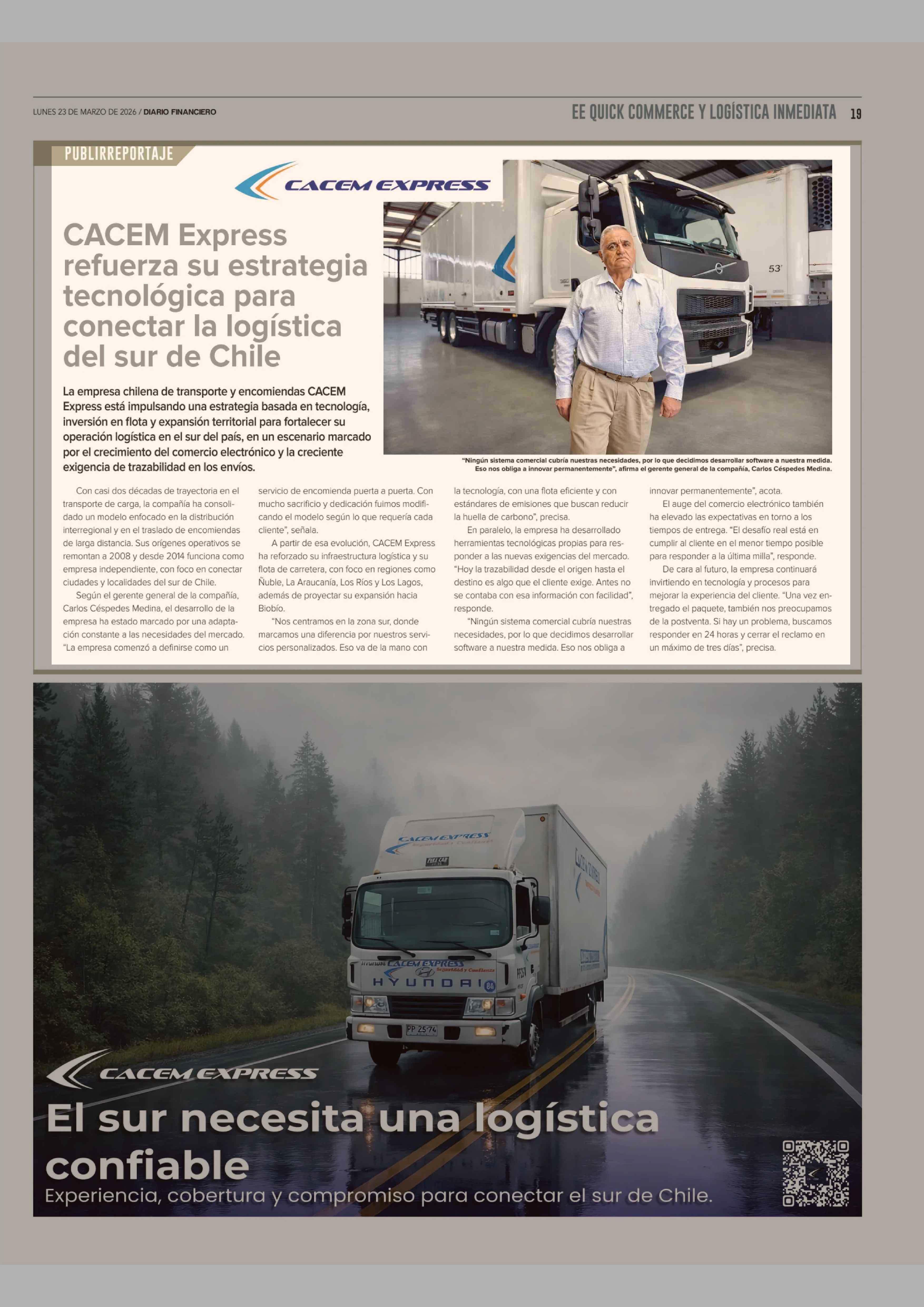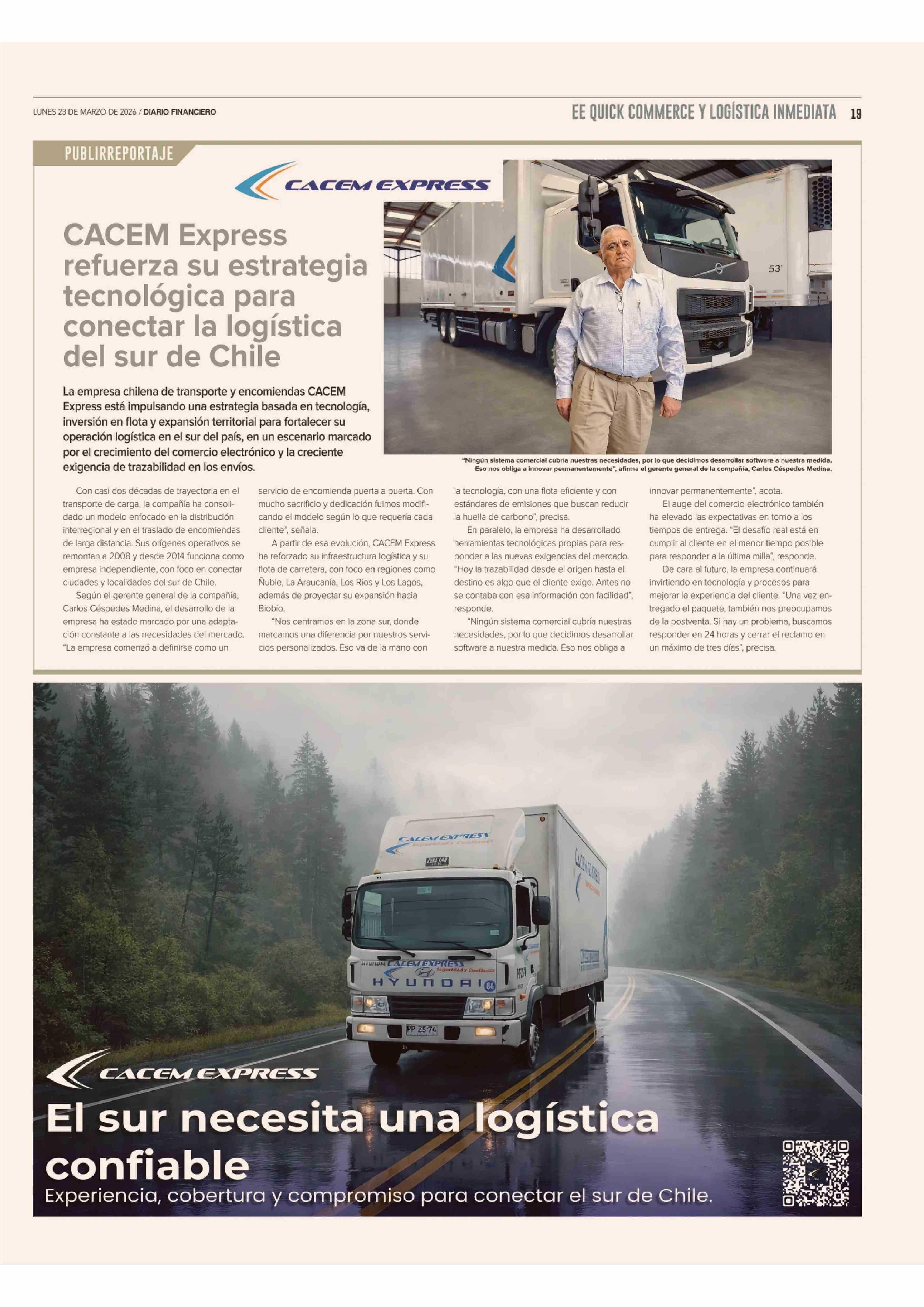 CACEM Express refuerza su estrategia tecnológica para conectar la logística del sur de Chile 23-03-2026 Diario Financiero |