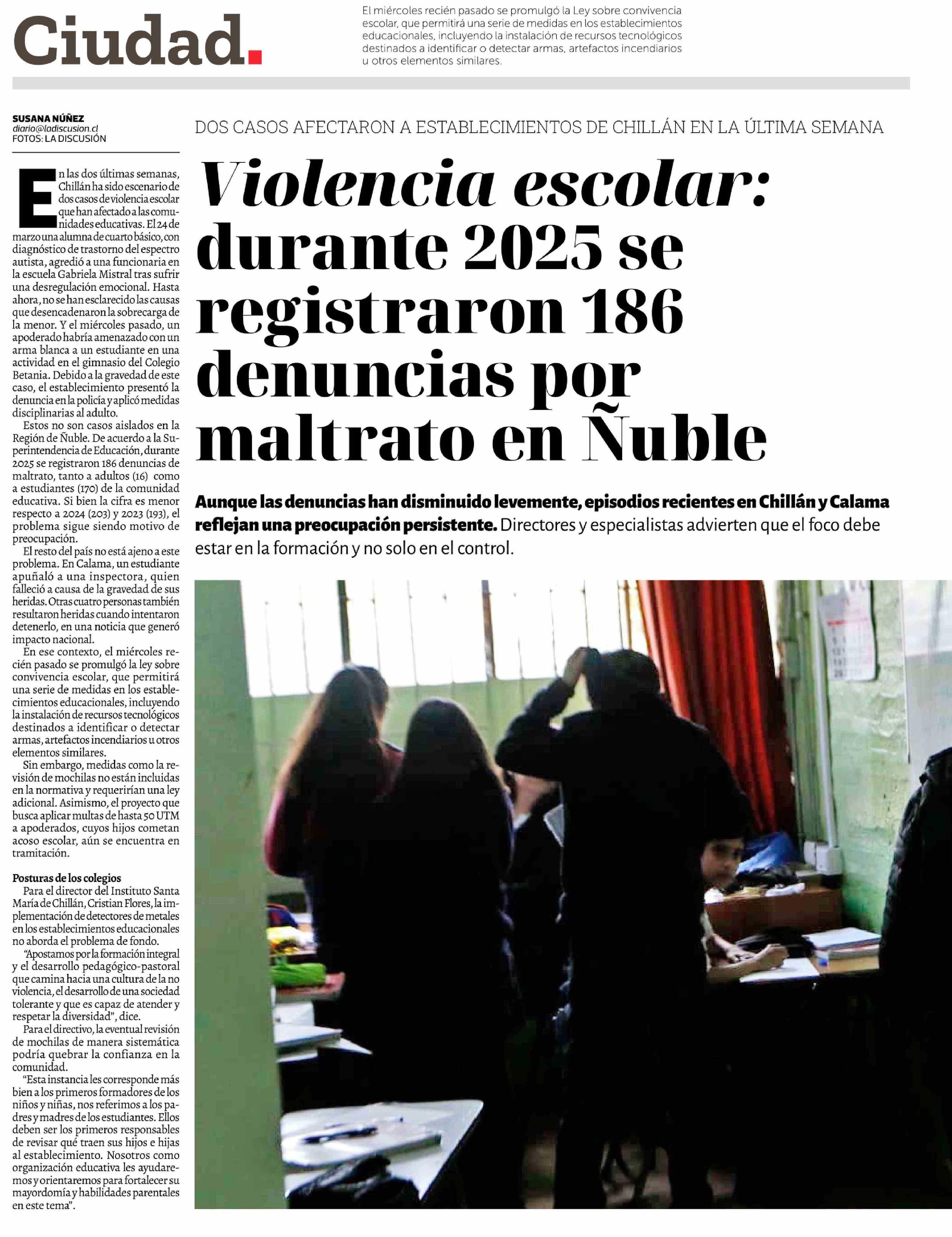 Título: Violencia escolar: durante 2025 se registraron 186 denuncias por maltrato en Nuble