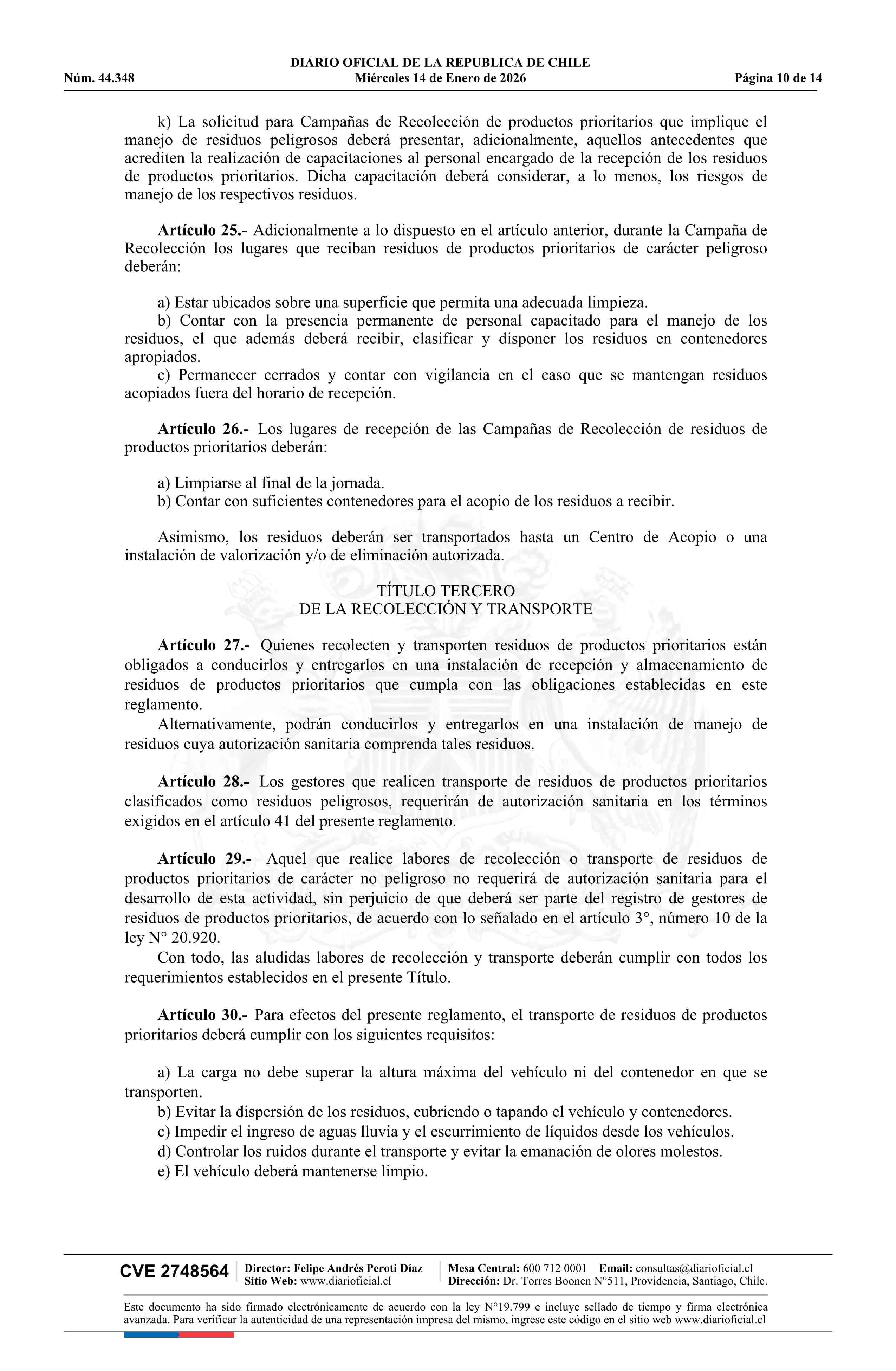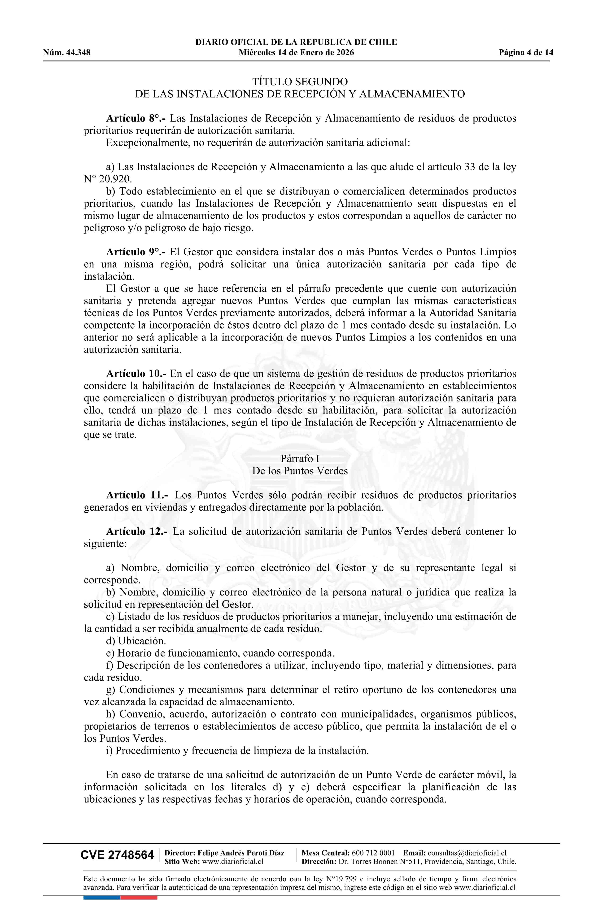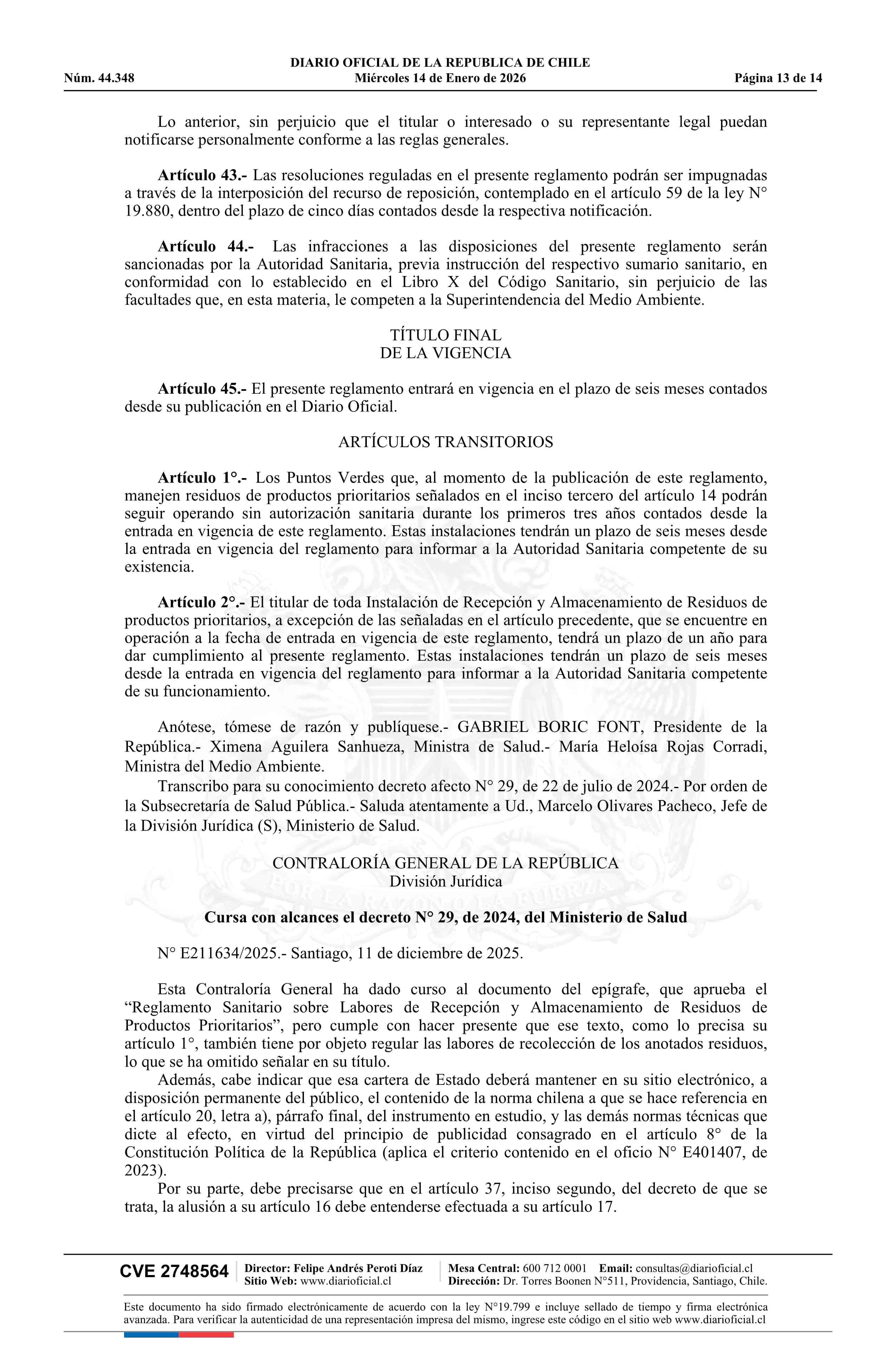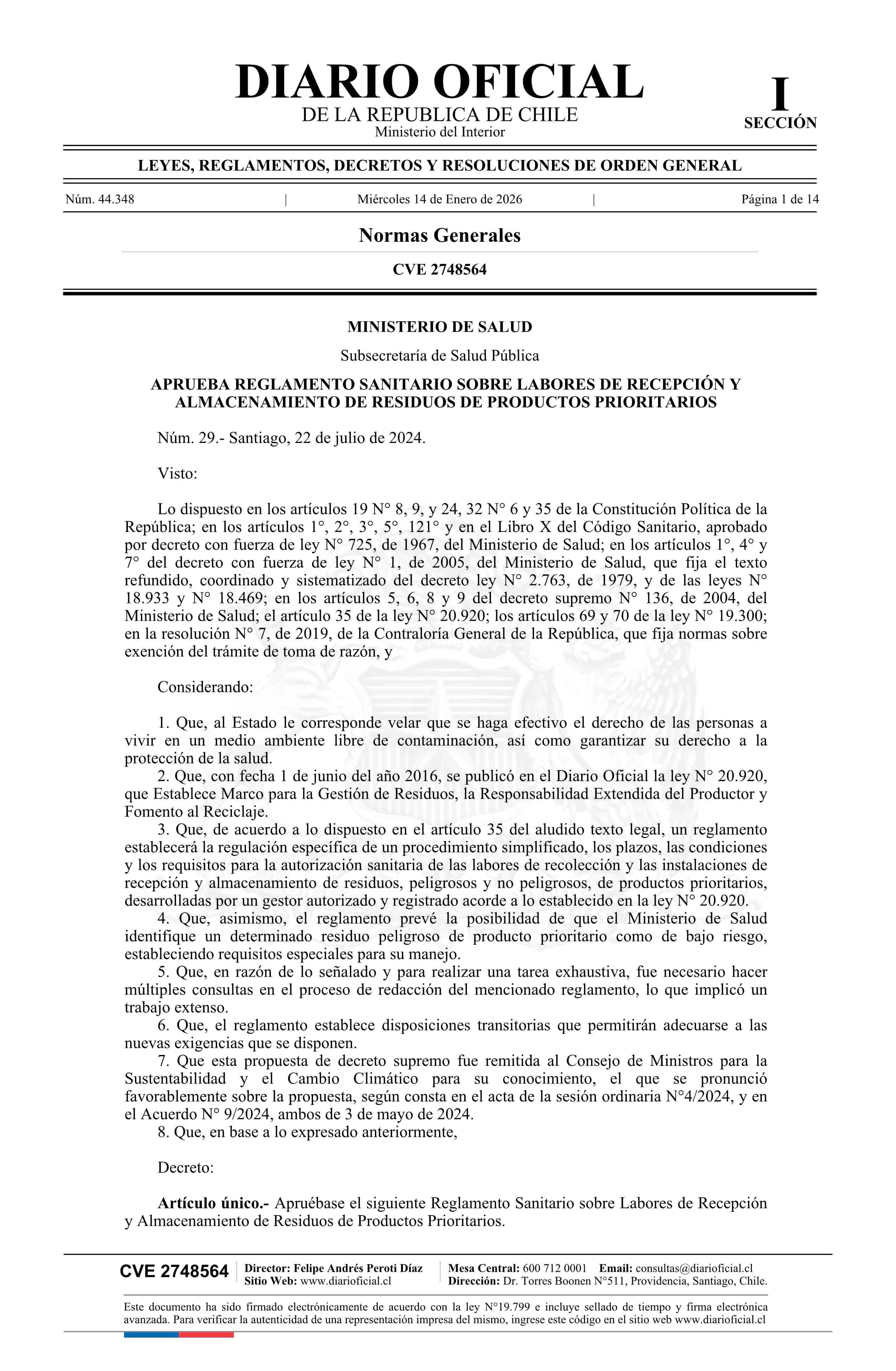 Decreto número 29, de 2024.- Aprueba Reglamento Sanitario sobre Labores de Recepción y Almacenamiento de Residuos de Productos Prioritarios 14-01-2026 Diario Oficial Edición Electrónica |