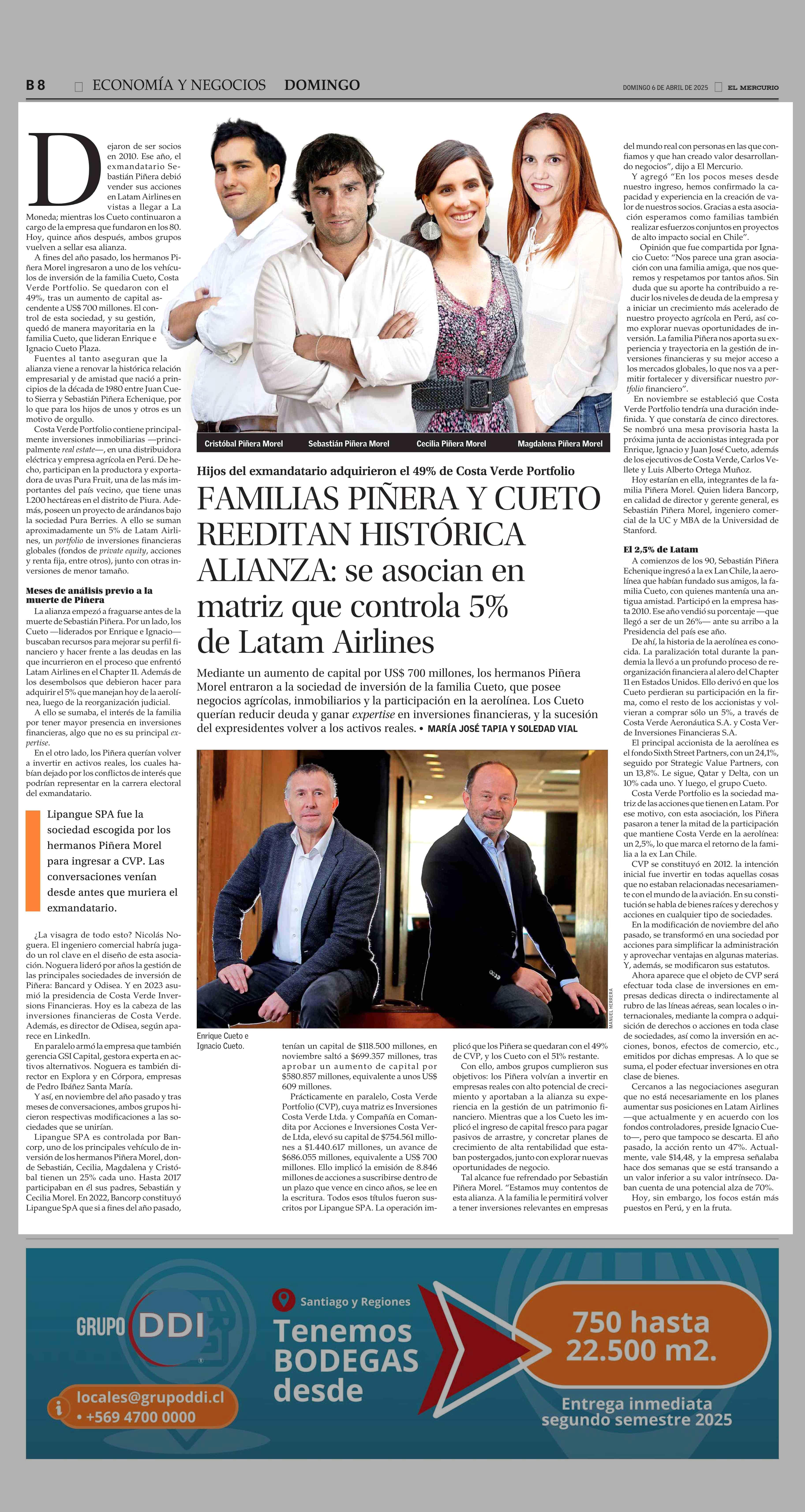 FAMILIAS PIÑERA Y CUETO REEDITAN HISTÓRICA ALIANZA: se asocian en matriz que controla 5% de Latam Airlines 06-04-2025 El Mercurio |