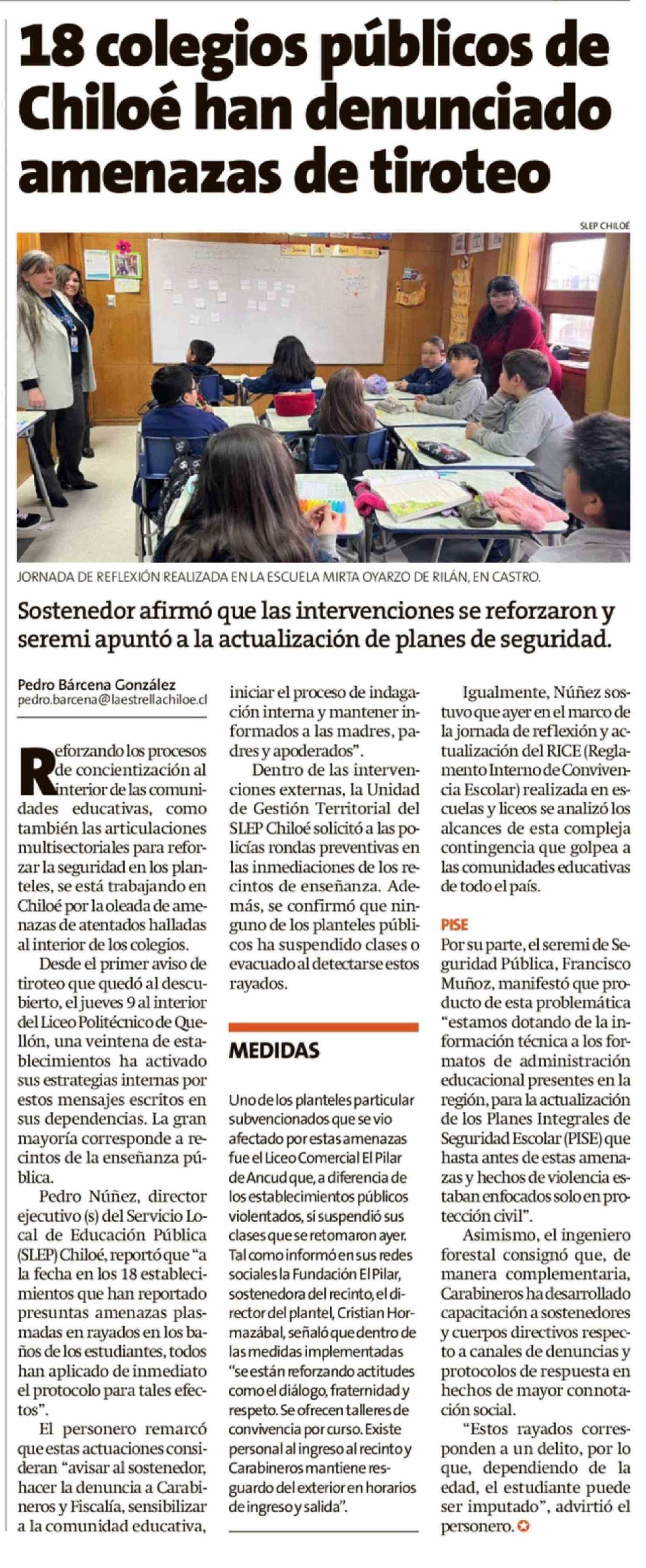 18 Colegios públicos de Chiloé han denunciado amenazas de tiroteo 17-04-2026 La Estrella de Chiloé |