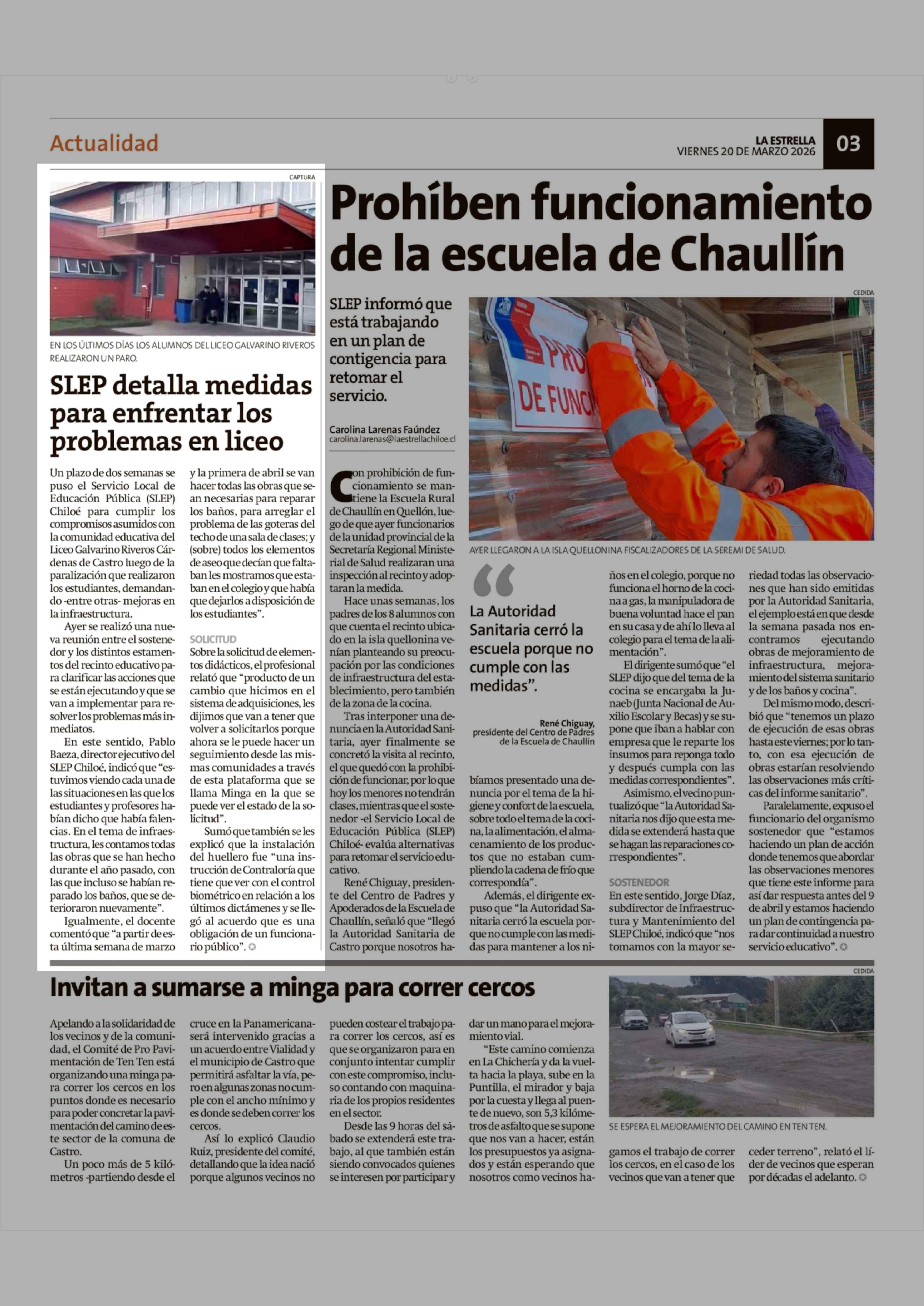 SLEP detalla medidas para enfrentar los problemas en liceo 20-03-2026 La Estrella de Chiloé |