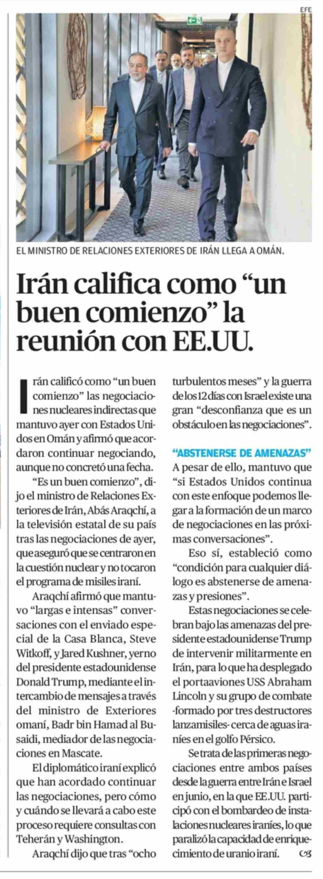 Irán califica como "un buen comienzo" la reunión con EE.UU. 07-02-2026 El Diario de Atacama |