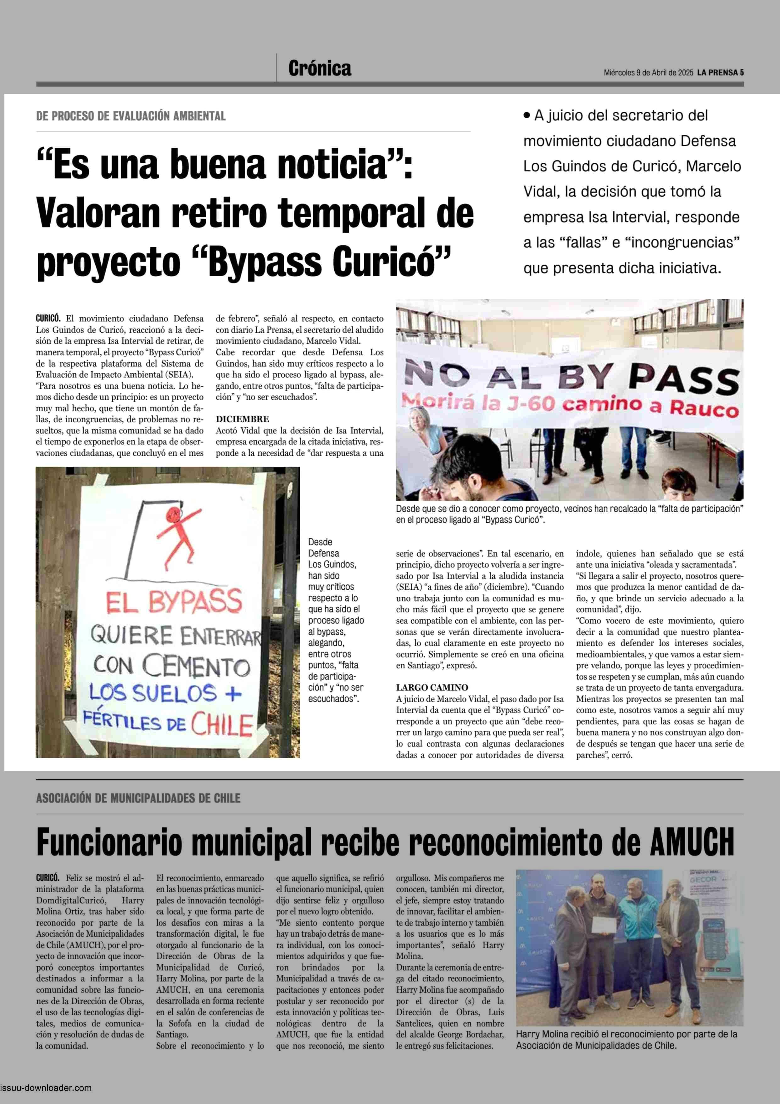 “Es una buena noticia”: Valoran retiro temporal de proyecto “Bypass Curicó” 09-04-2025 La Prensa de Curicó |