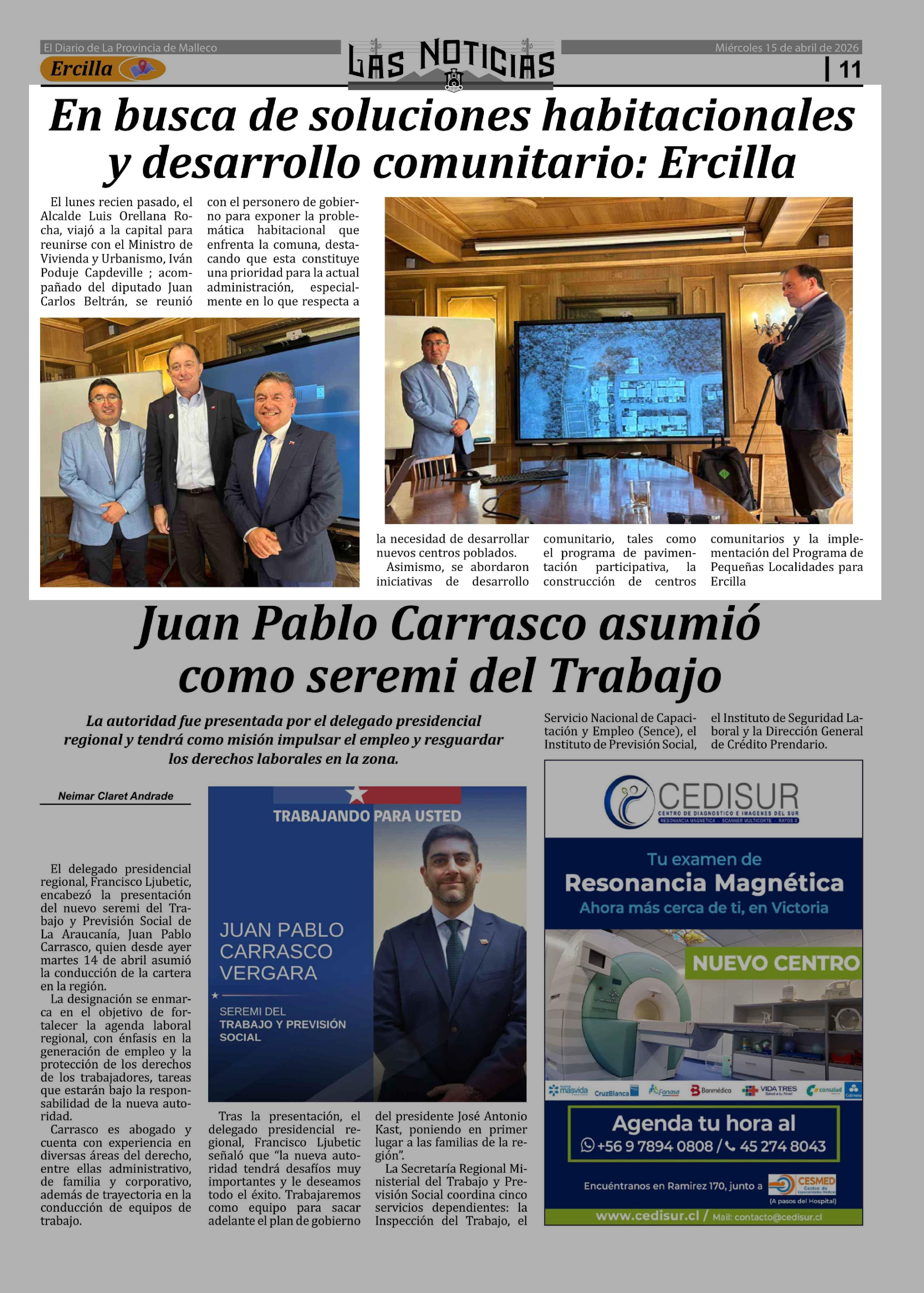 En busca de soluciones habitacionales y desarrollo comunitario: Ercilla 15-04-2026 Las Noticias |
