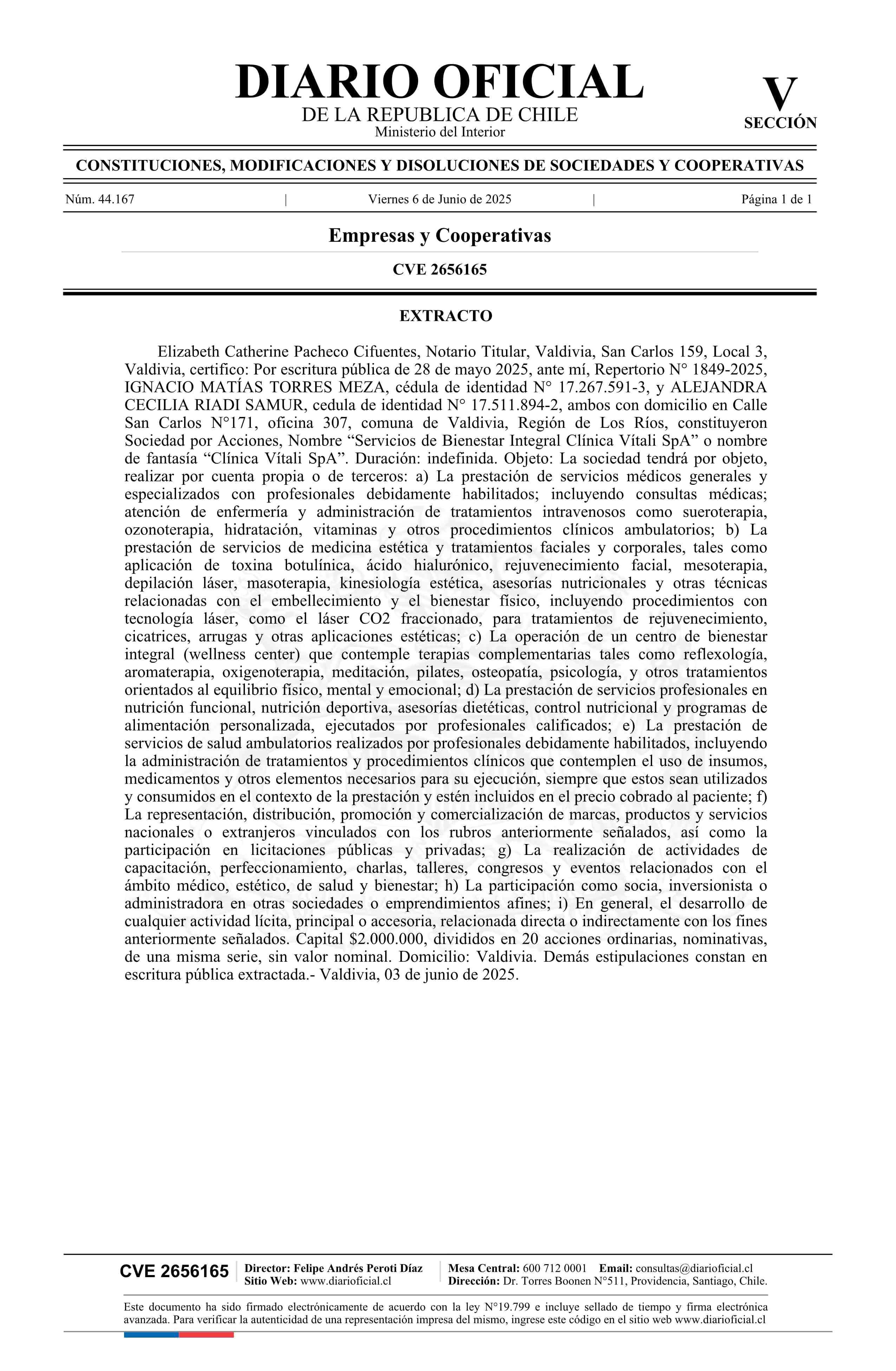 Servicios de Bienestar Integral Clínica Vítali SpA 06-06-2025 Diario Oficial Edición Electrónica |