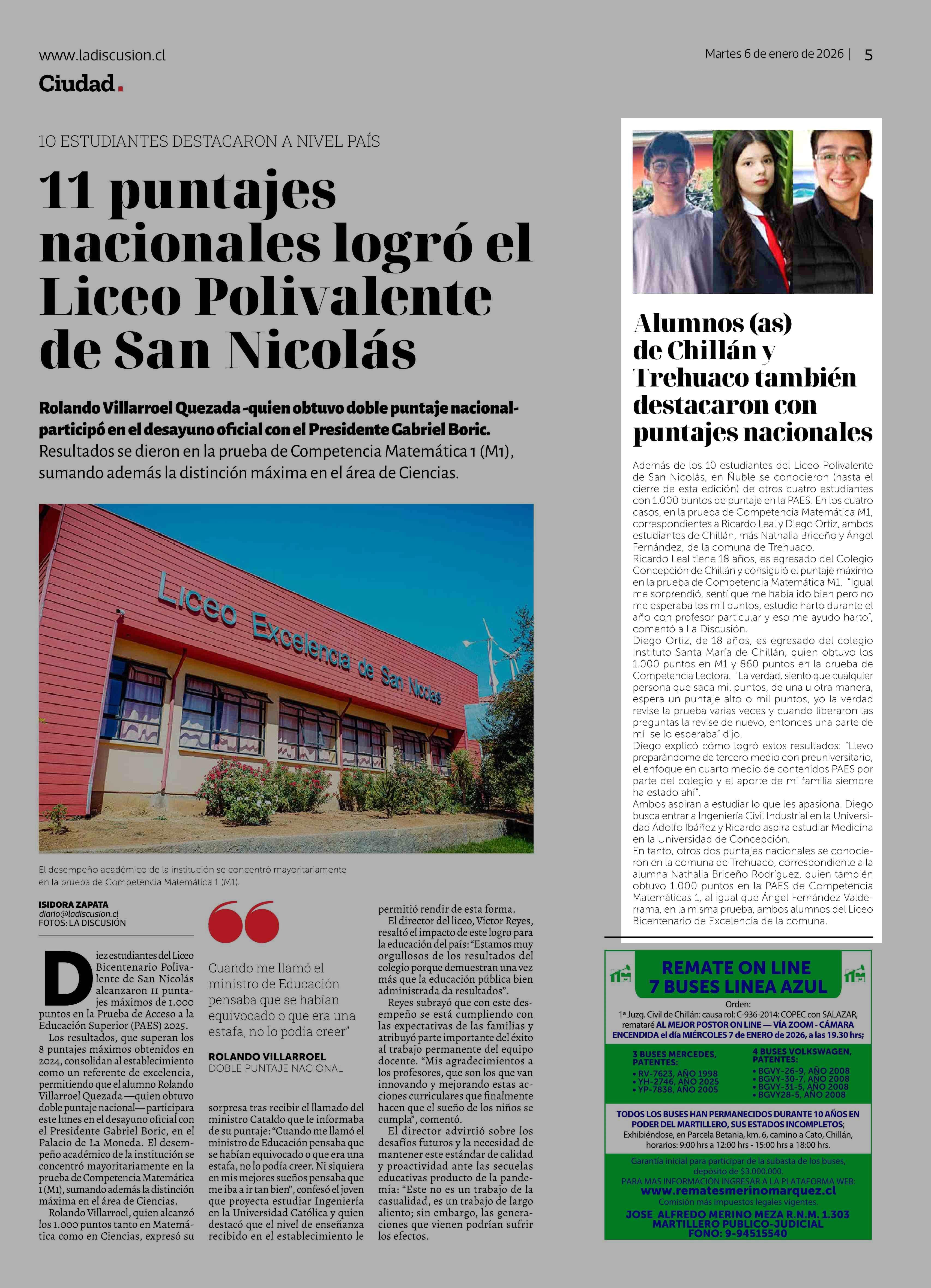 Alumnos (as) de Chillán y Trehuaco también destacaron con puntajes nacionales 06-01-2026 La Discusión |