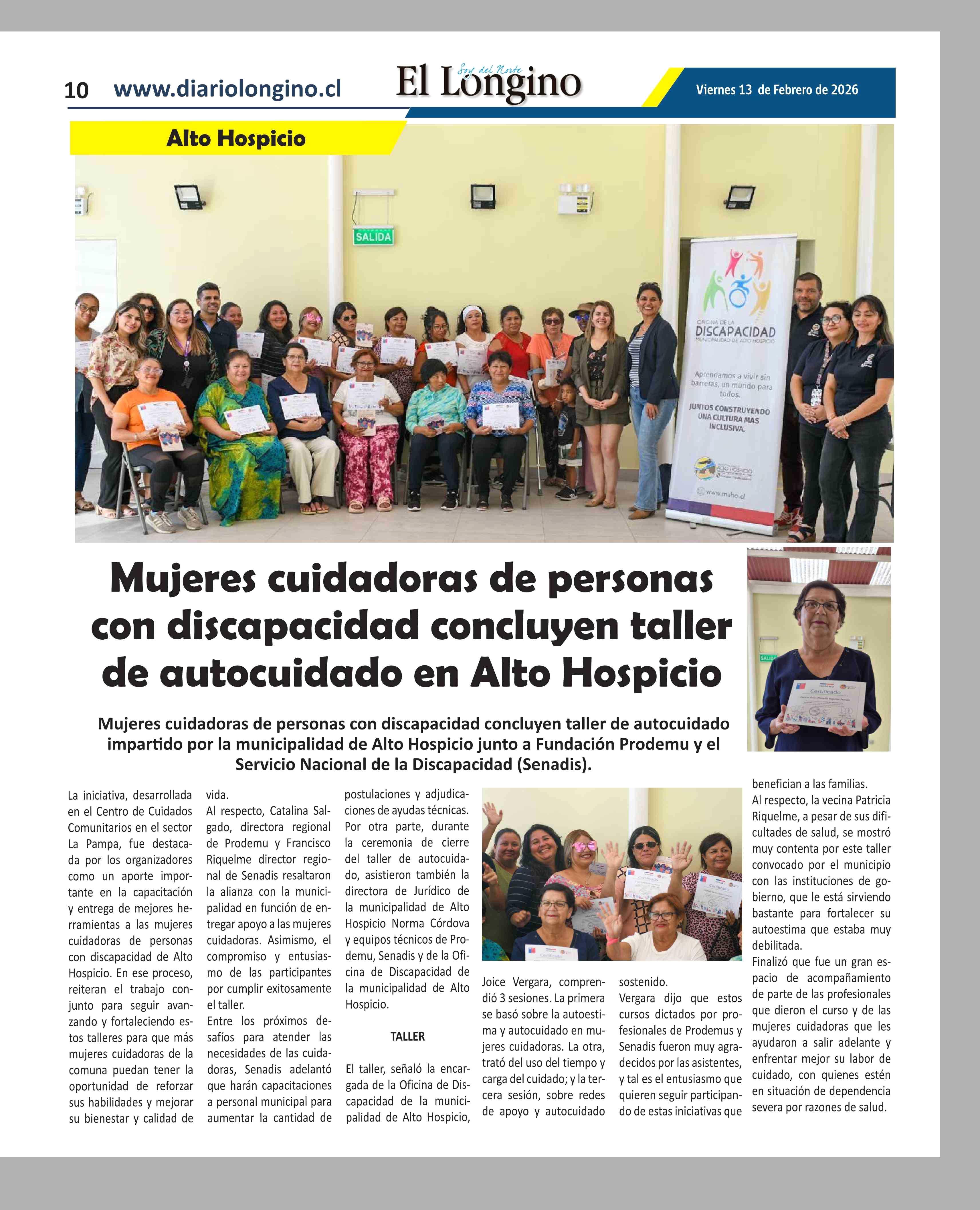 Mujeres cuidadoras de personas con discapacidad concluyen taller de autocuidado en Alto Hospicio 13-02-2026 El Longino |