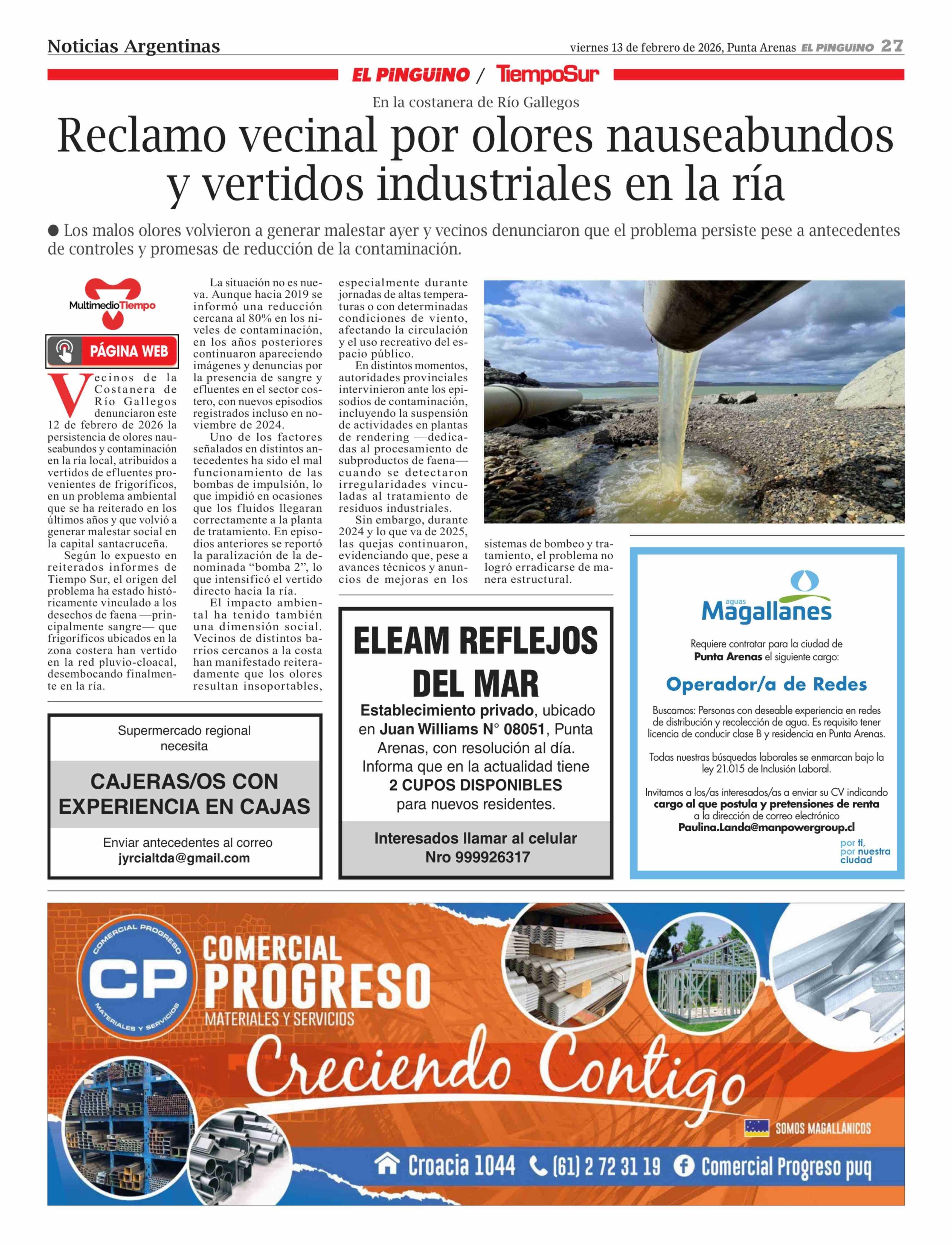 Reclamo vecinal por olores nauseabundos y vertidos industriales en la ría 13-02-2026 El Pingüino |