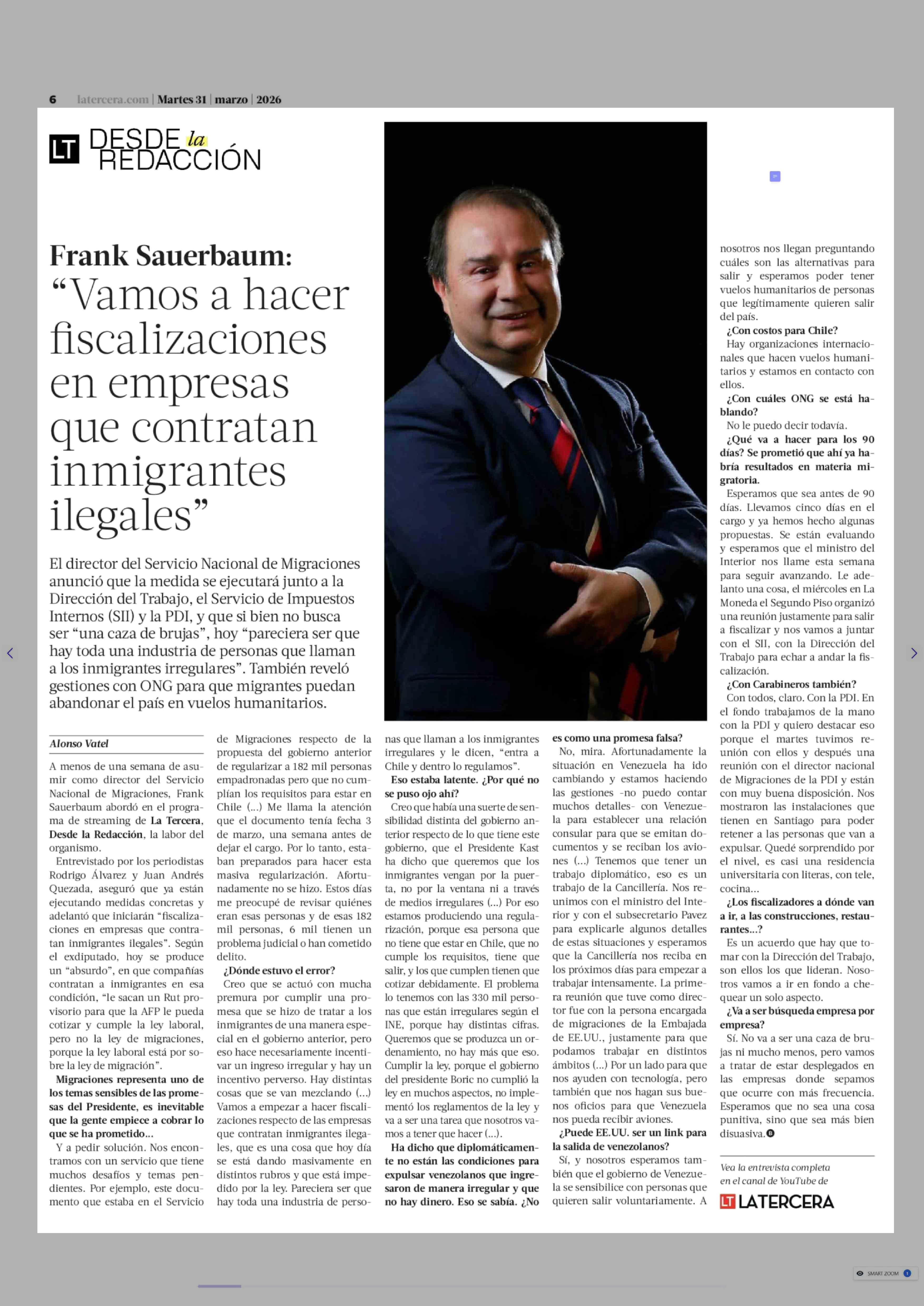Título: "Vamos a hacer fiscalizaciones en empresas que contratan inmigrantes ilegales"