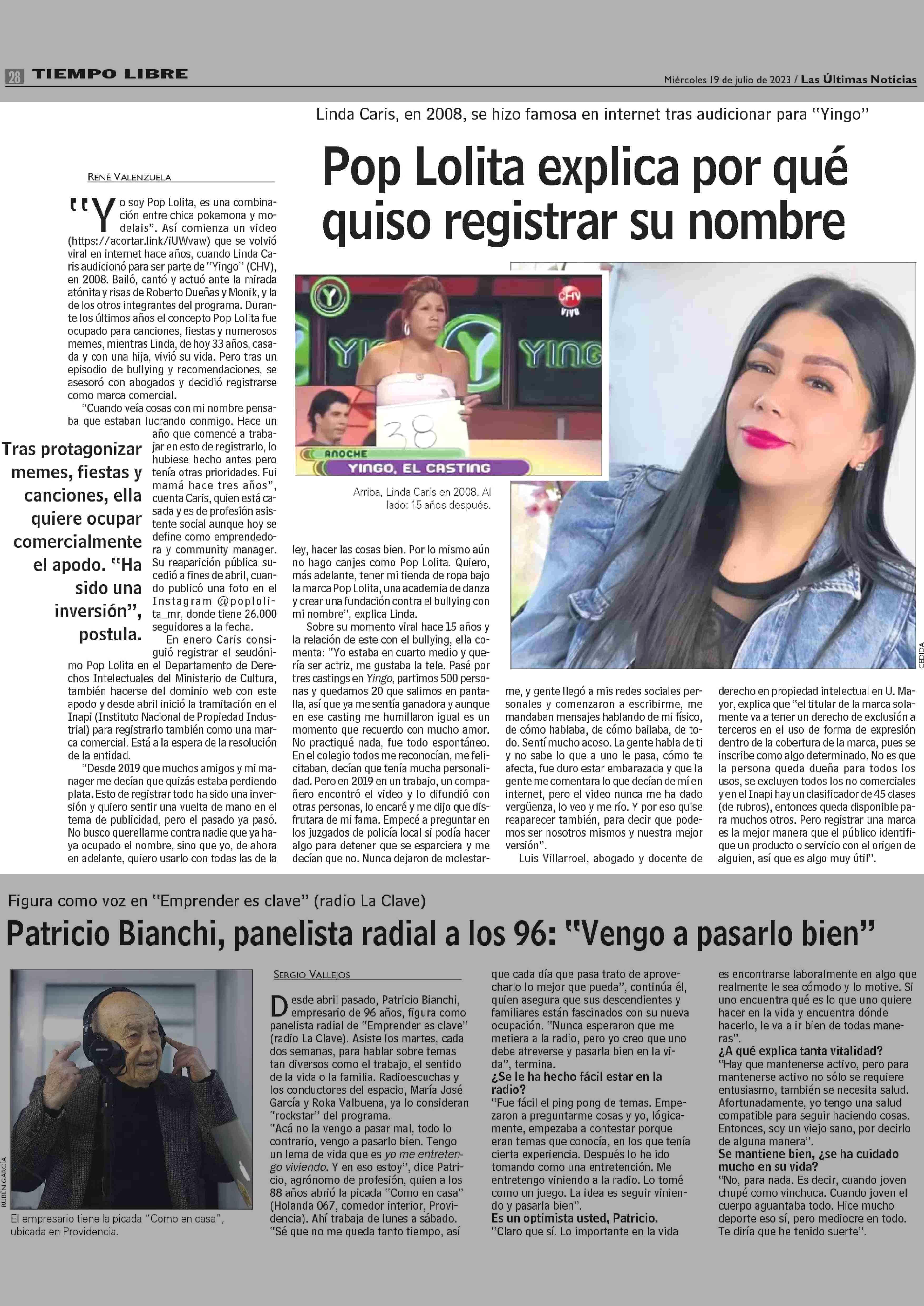 Pop Lolita explica por qué quiso registrar su nombre 19-07-2023 Las Últimas Noticias Segunda Edición - Chile |