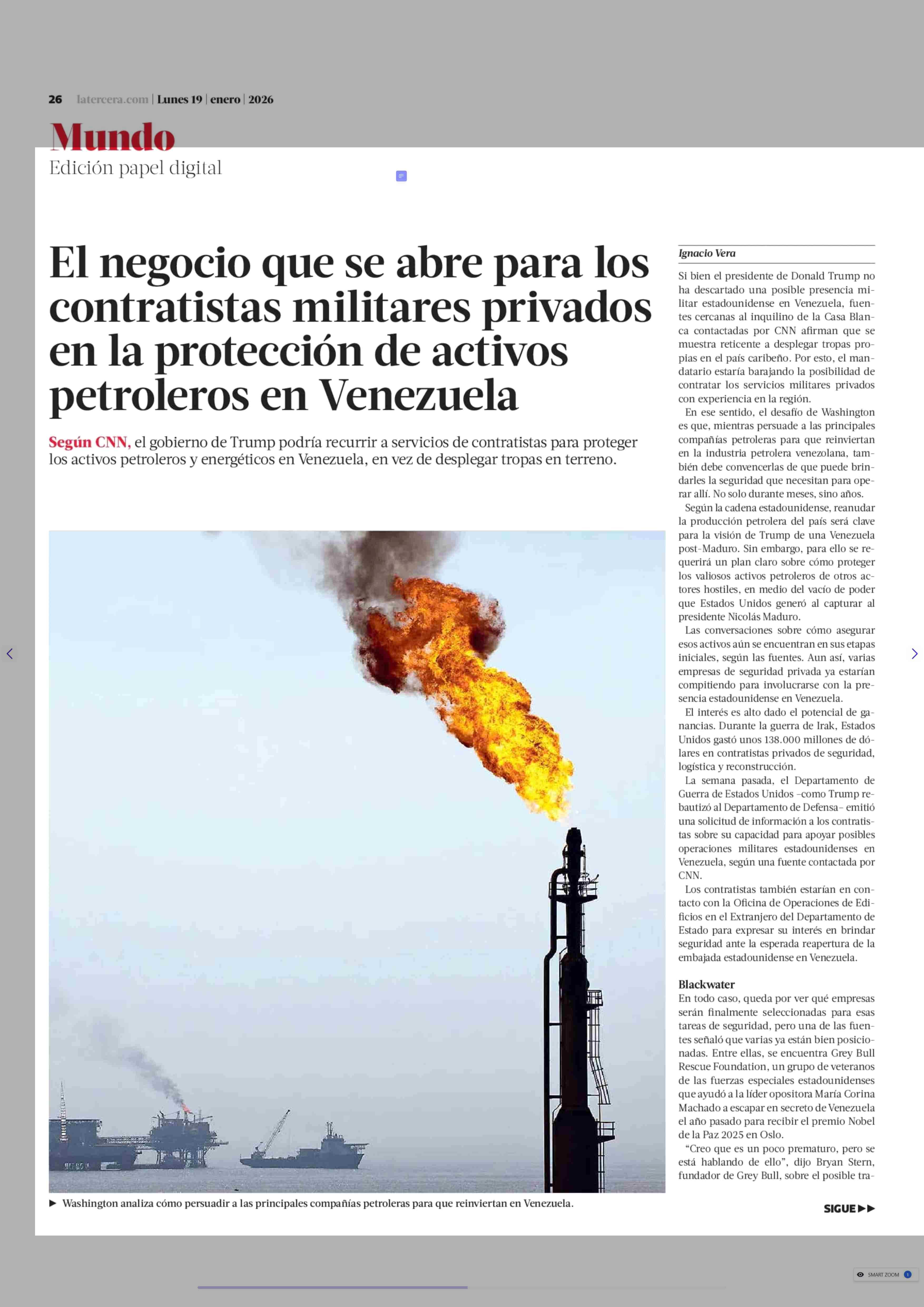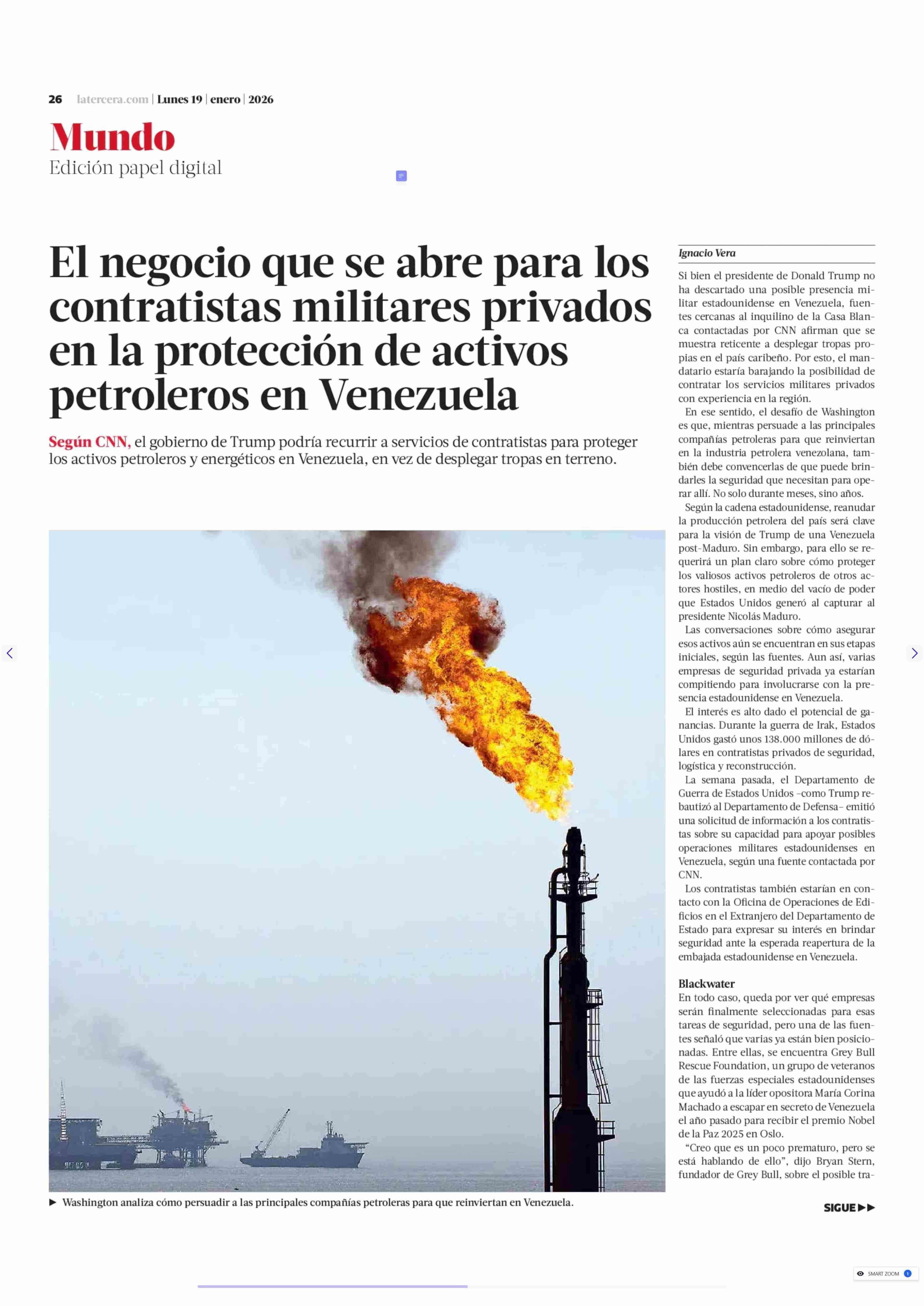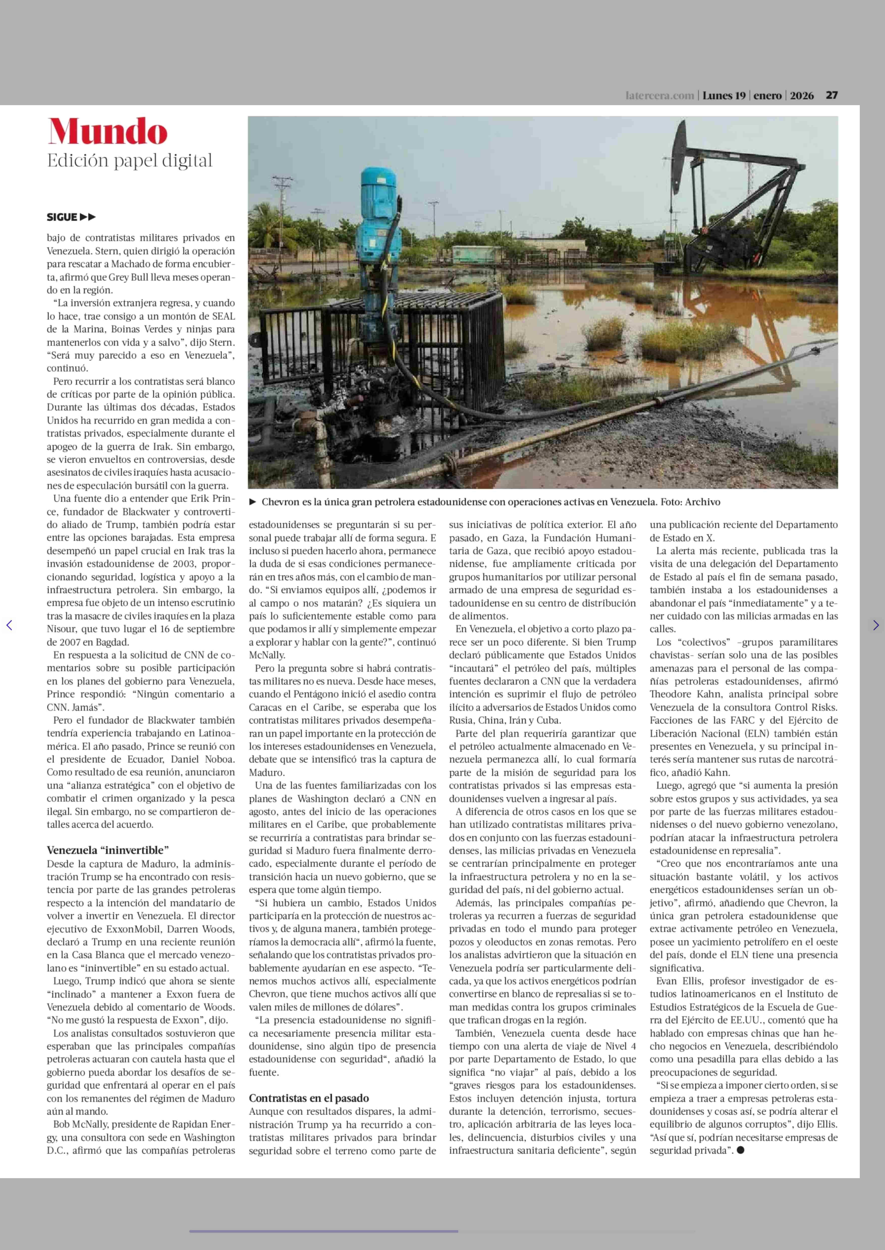 El negocio que se abre para los contratistas militares privados en la protección de activos petroleros en Venezuela 19-01-2026 La Tercera |