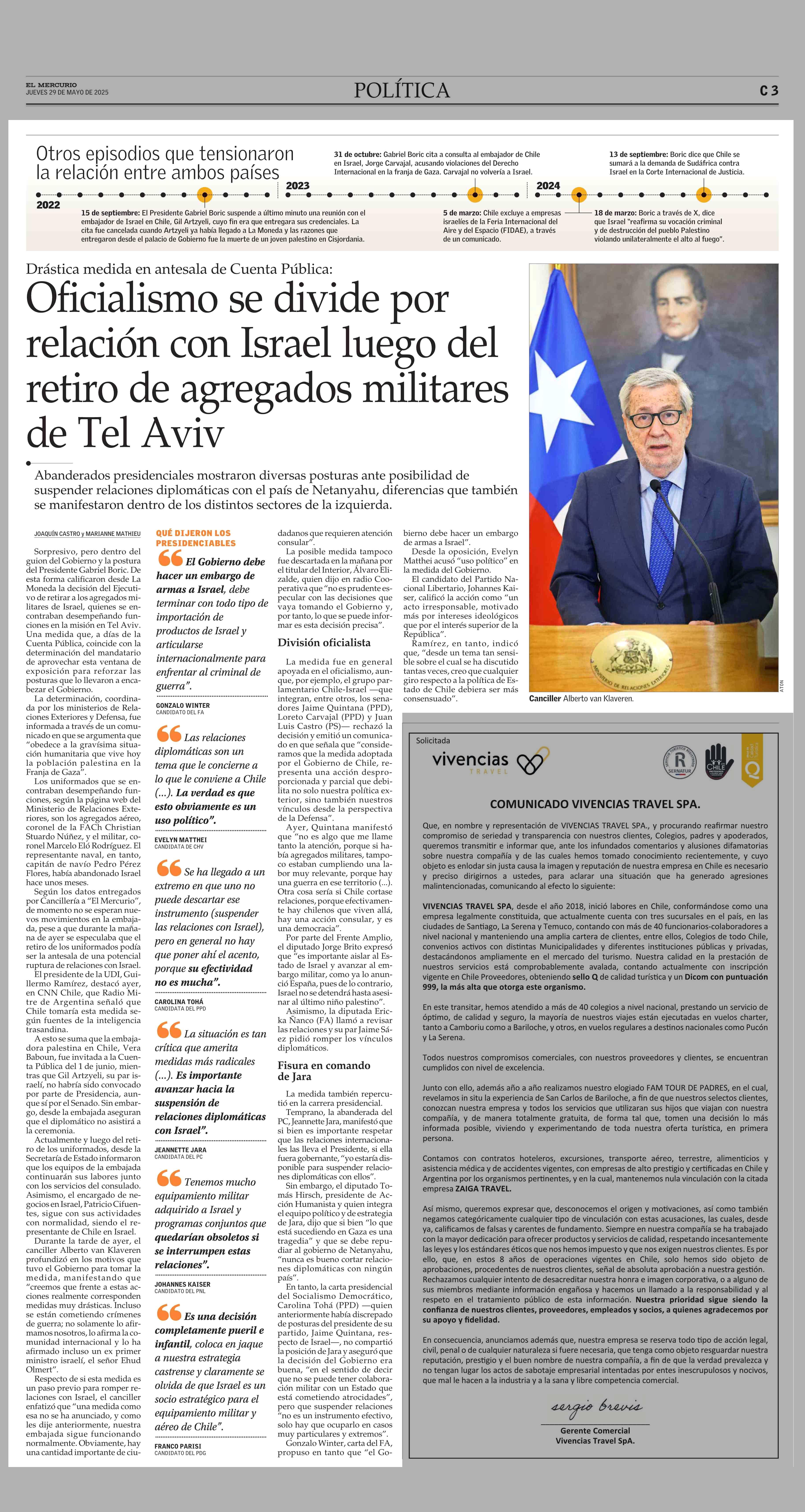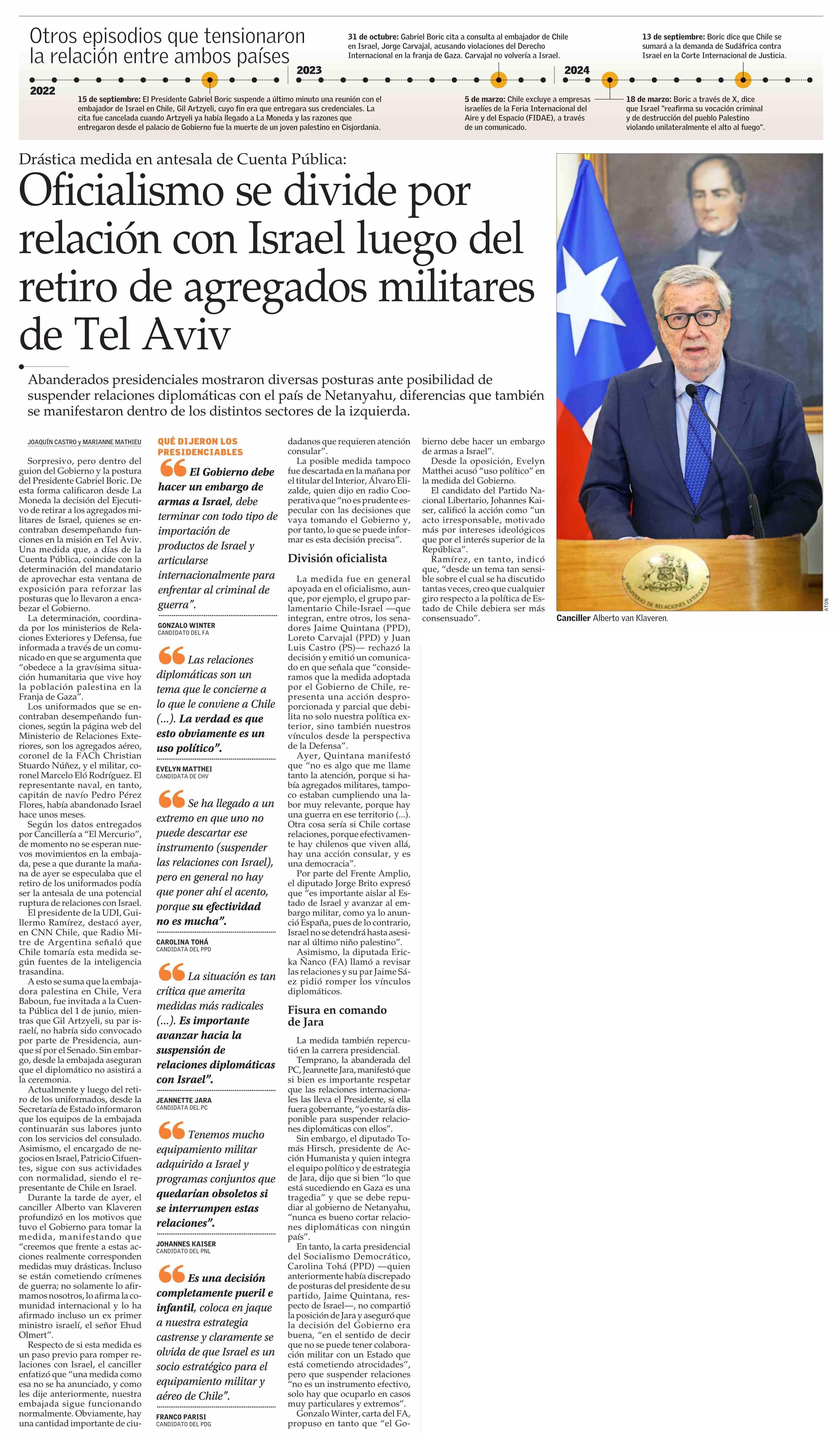 Oficialismo se divide por relación con Israel luego del retiro de agregados militares de Tel Aviv 29-05-2025 El Mercurio |