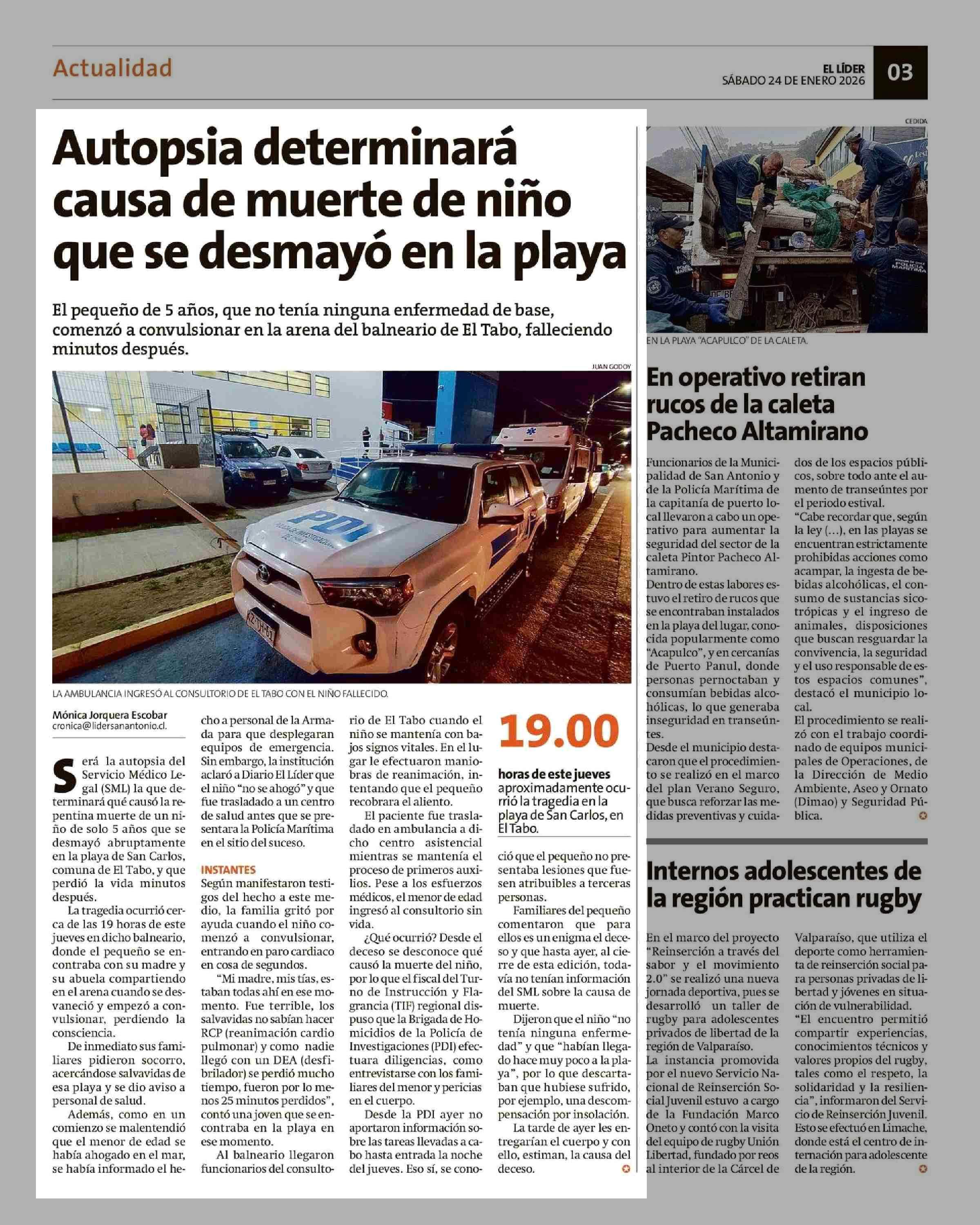 Autopsia determinará causa de muerte de niño que se desmayo en la playa 24-01-2026 El Líder |