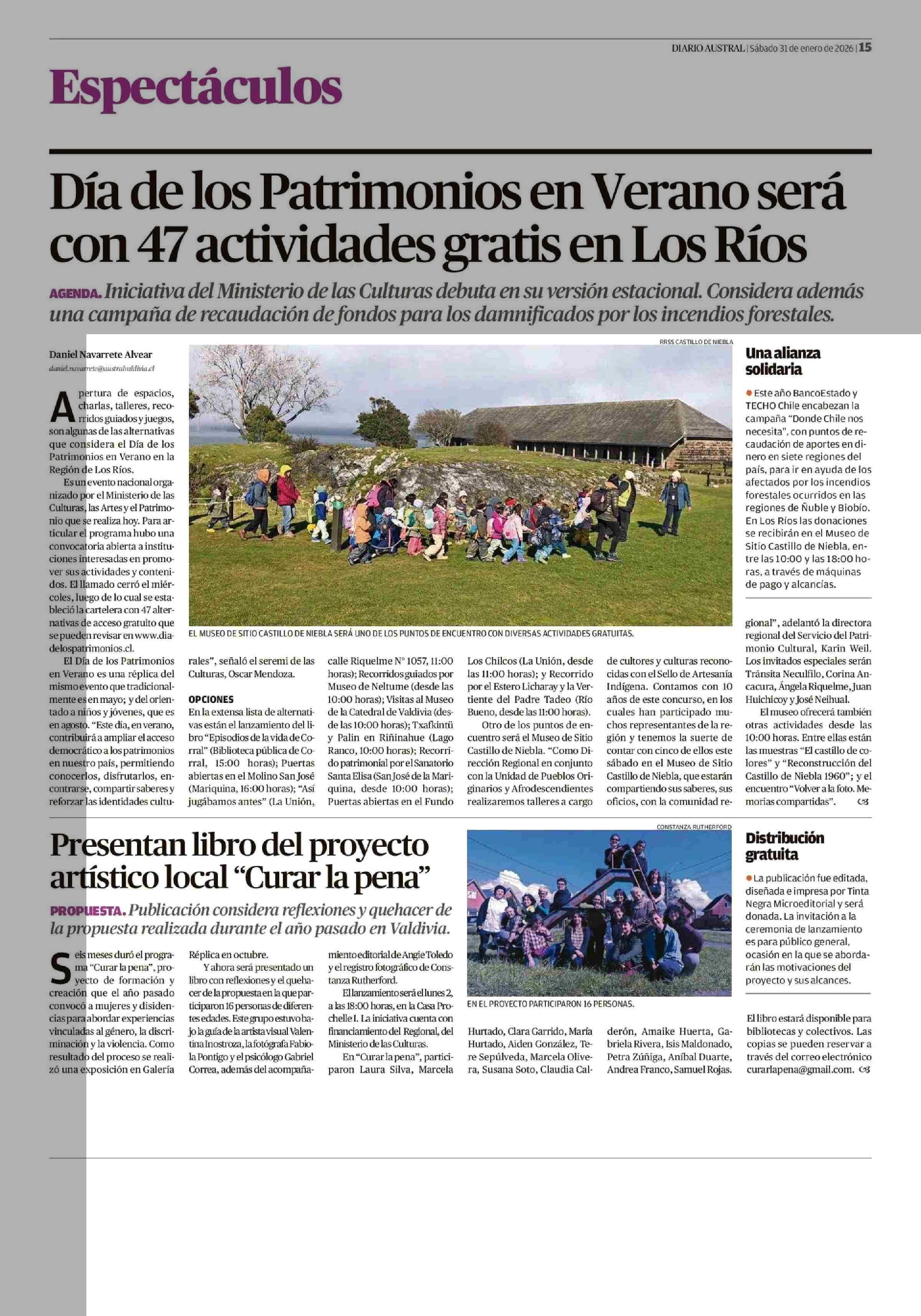 Día de los Patrimonios en Verano será con 47 actividades gratis en Los Ríos 31-01-2026 Diario Austral Región de Los Ríos |