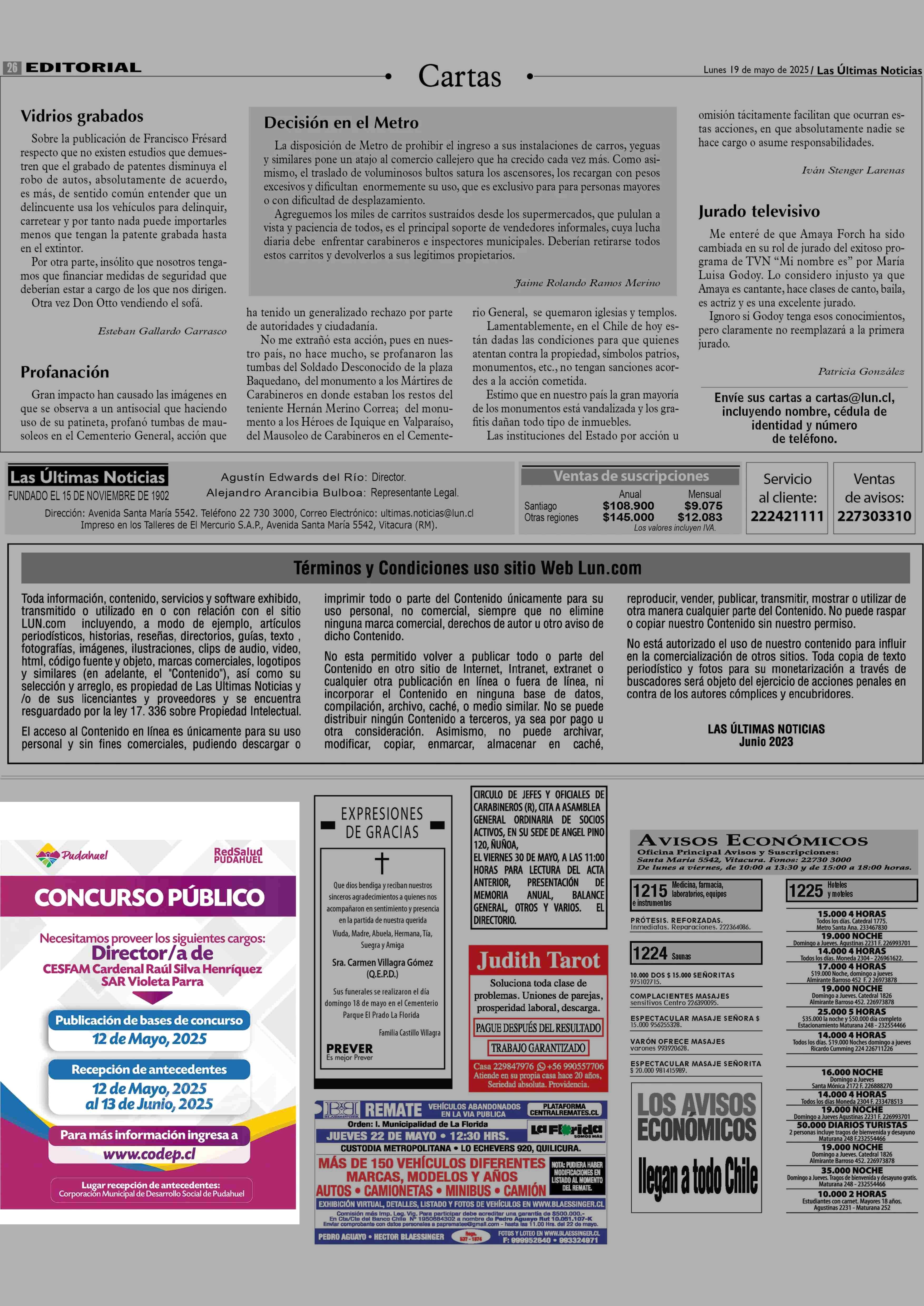 AVISO LICITACIONES: CONCURSO PÚBLICO 19-05-2025 Las Últimas Noticias |