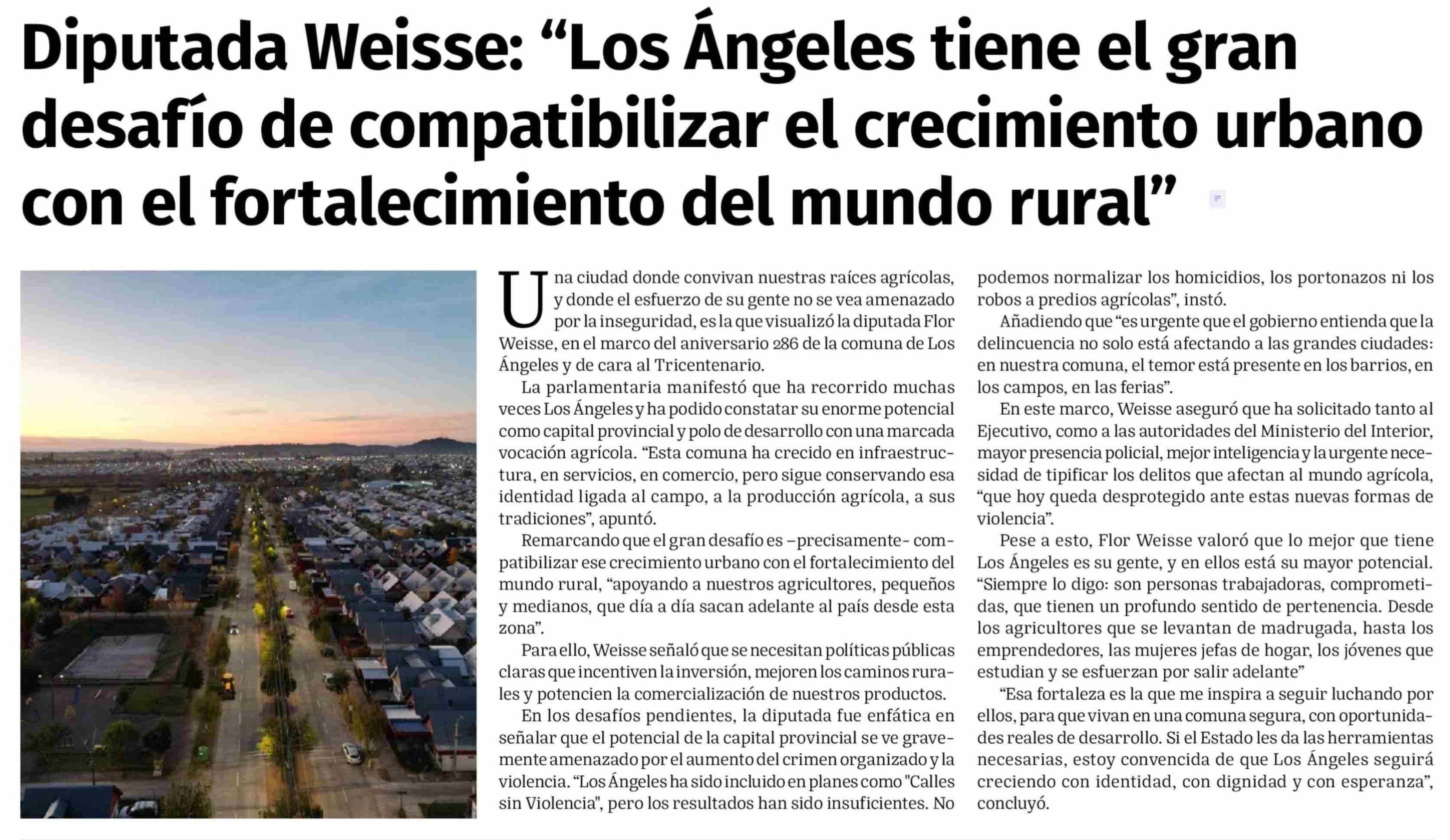 | Título: | Diputada Weisse: “Los Ángeles tiene el gran desafio de compatibilizar el crecimiento urbano con el fortalecimiento del mundo rural” |