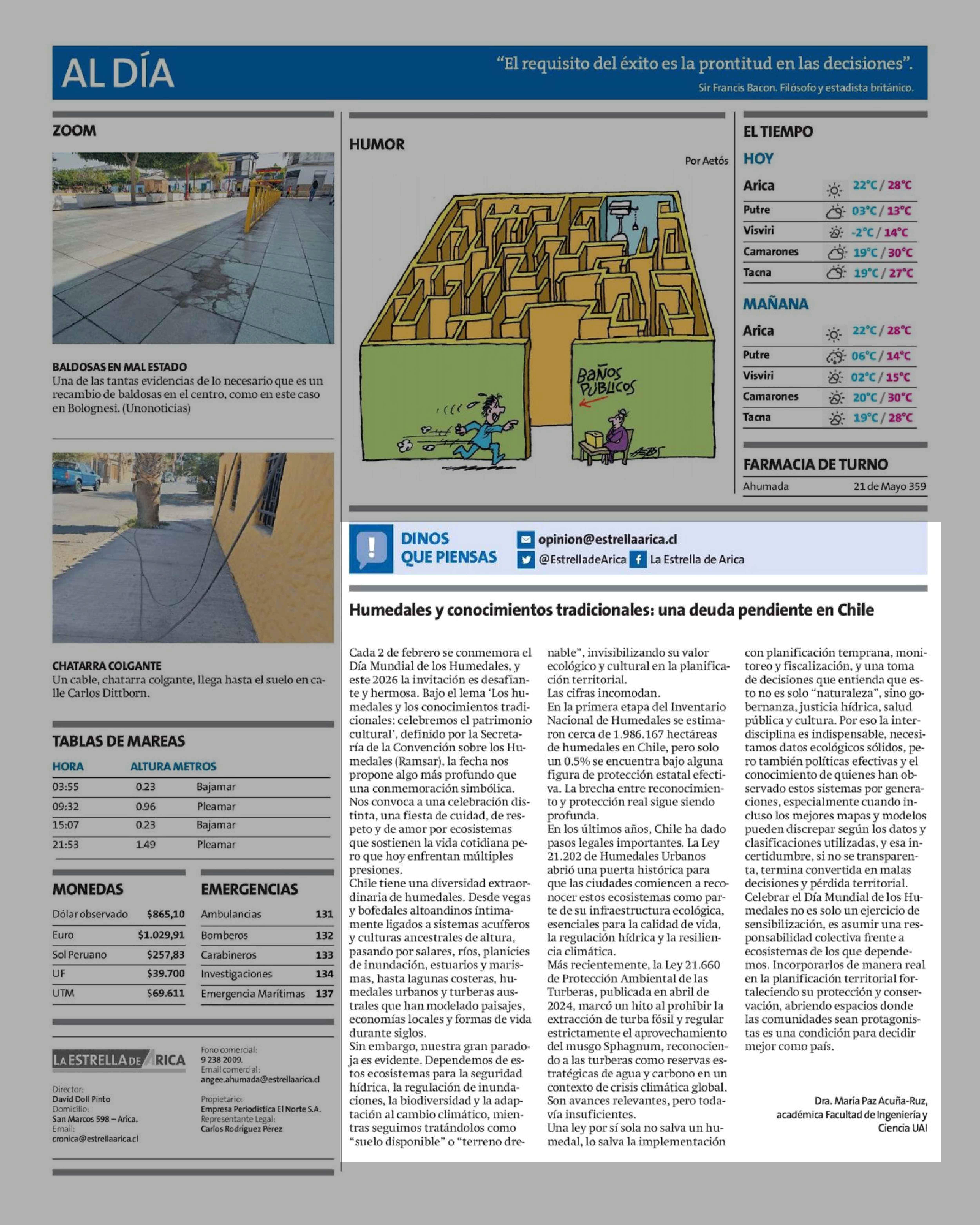 Título: Cartas: Cada 2 de febrero se conmemora el Día Mundial de los Humedales, y este 2026 la invitación es desafiante y hermosa. Bajo el lema 'Los humedales y los conocimientos tradicionales: celebremos el patrimonio cultural', definido por la Secretaría de la Convención sobre los Humedales (Ramsar), la f