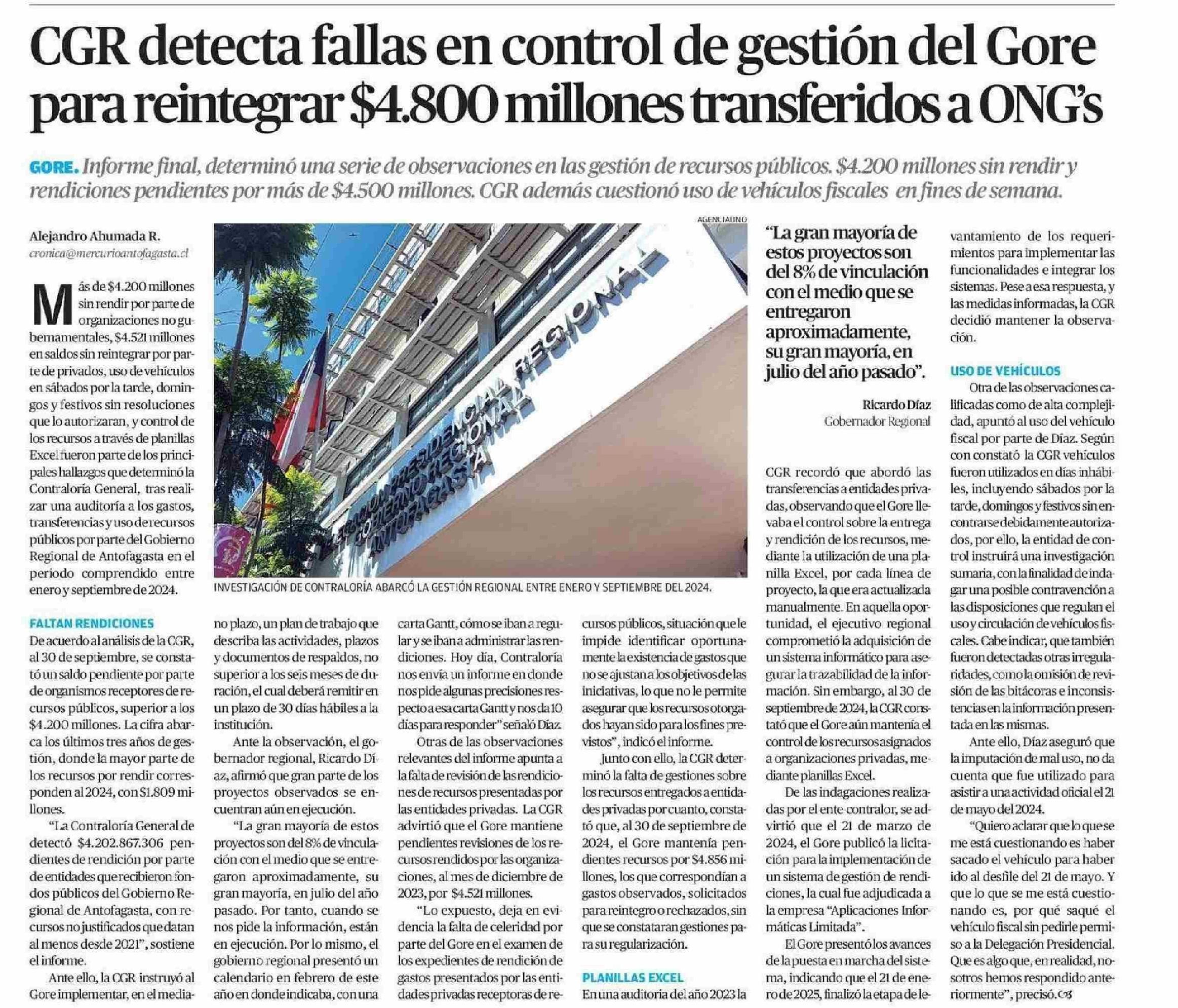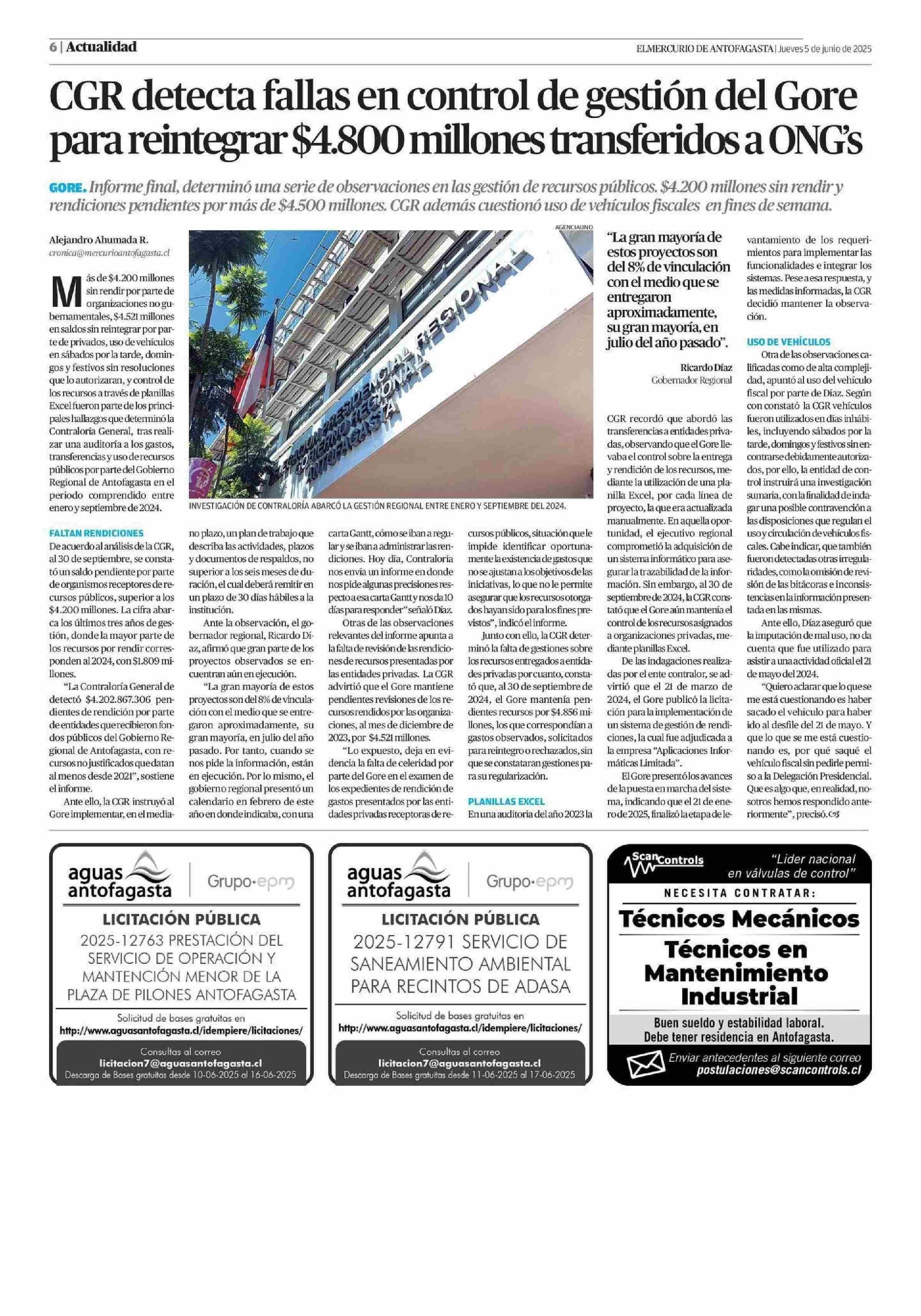 CGR detecta fallas en control de gestión del Gore para reintegrar $4.800 millones transferidos a ONGS 05-06-2025 El Mercurio de Antofagasta |