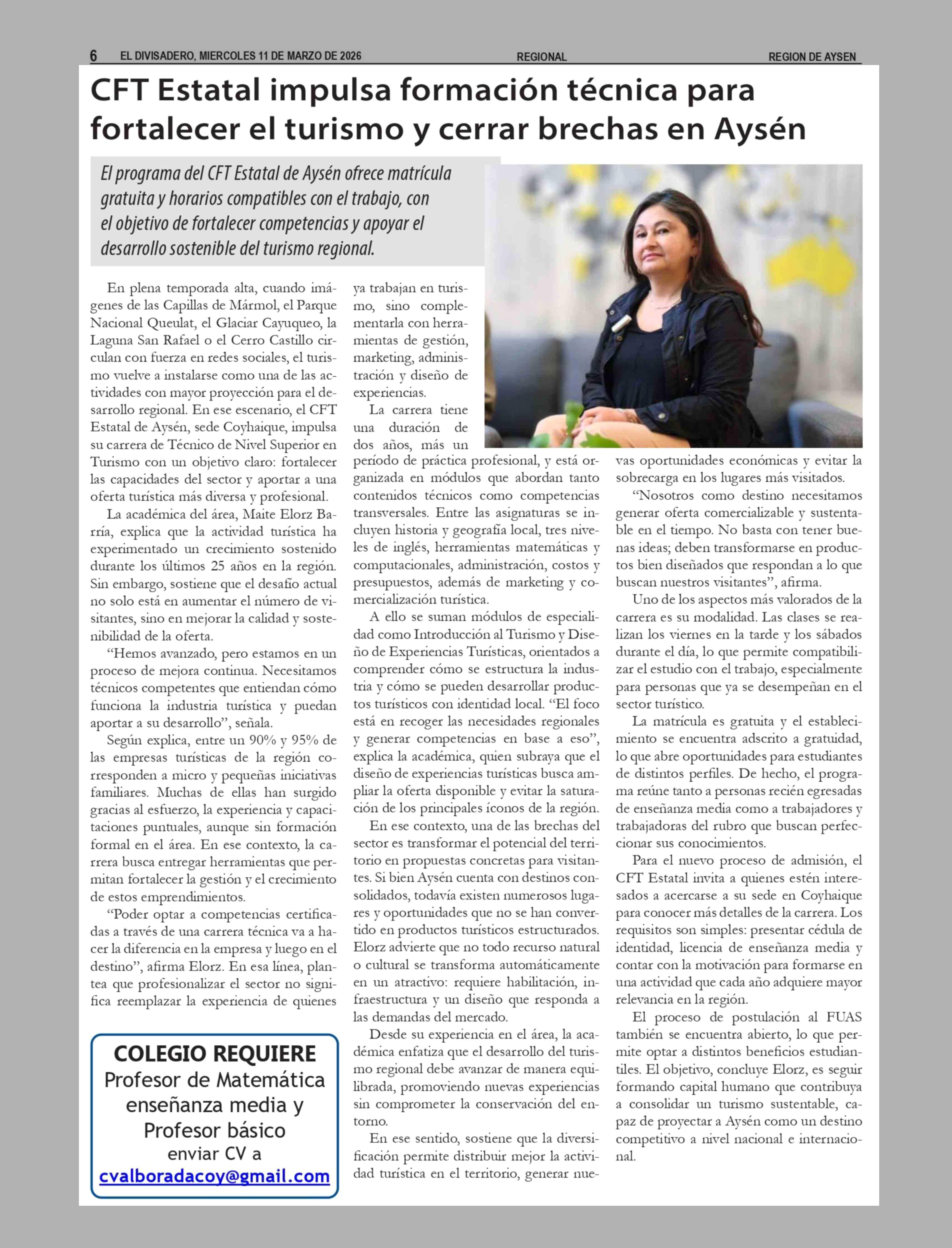 CFT Estatal impulsa formación técnica para fortalecer el turismo y cerrar brechas en Aysén 11-03-2026 El Divisadero |