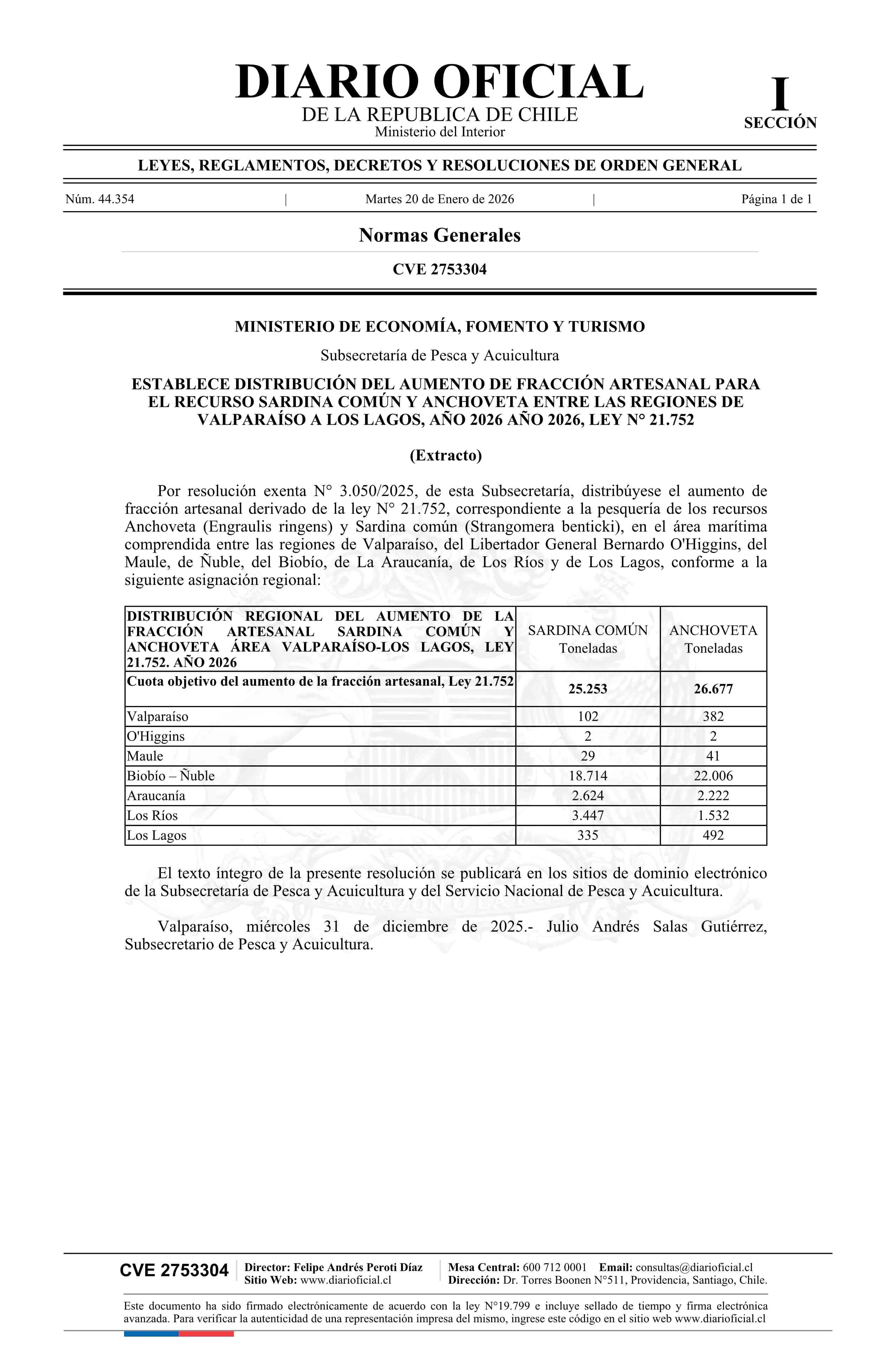 | Título: | Extracto de resolución exenta número 3.050, de 2025.- Establece distribución del aumento de fracción artesanal para el recurso Sardina común y Anchoveta entre las regiones de Valparaíso a Los Lagos, año 2026, ley N° 21.752 |