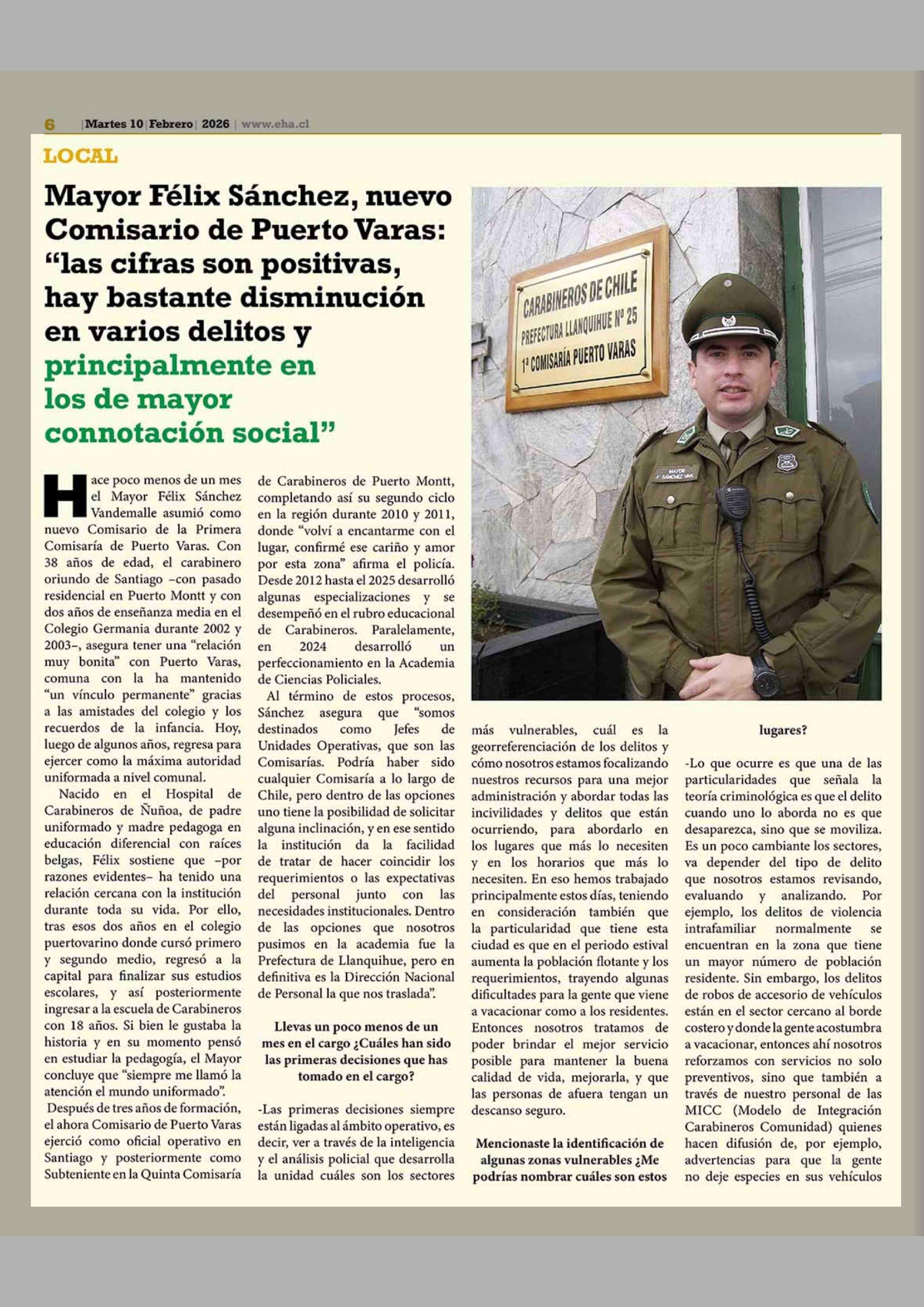 | Título: | Mayor Félix Sánchez, nuevo Comisario de Puerto Varas: "las cifras son positivas, hay bastante disminución en varios delitos y principalmente en los de mayor connotación social" |