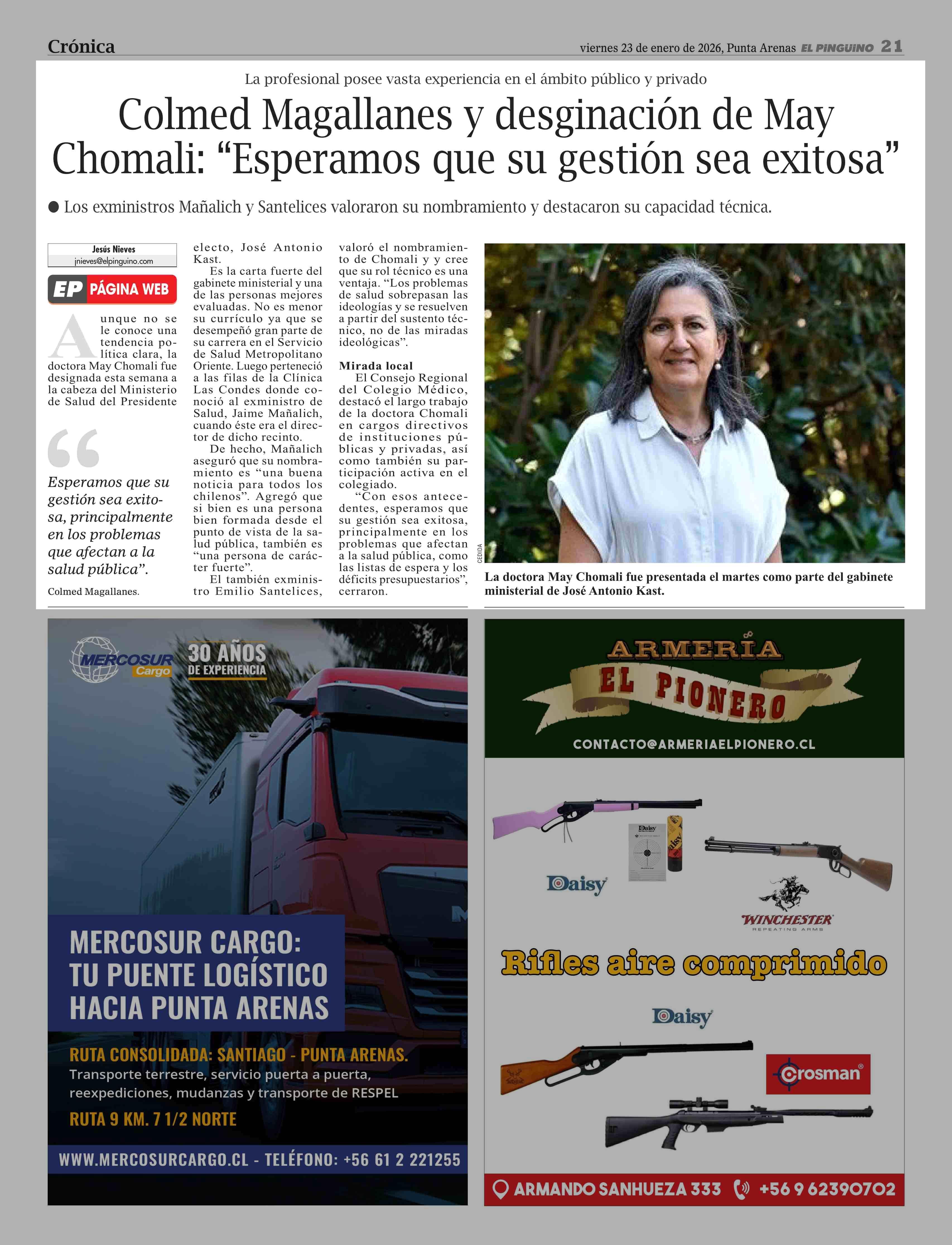 Título: Colmed Magallanes y desginación de May Chomali: "Esperamos que su gestión sea exitosa"