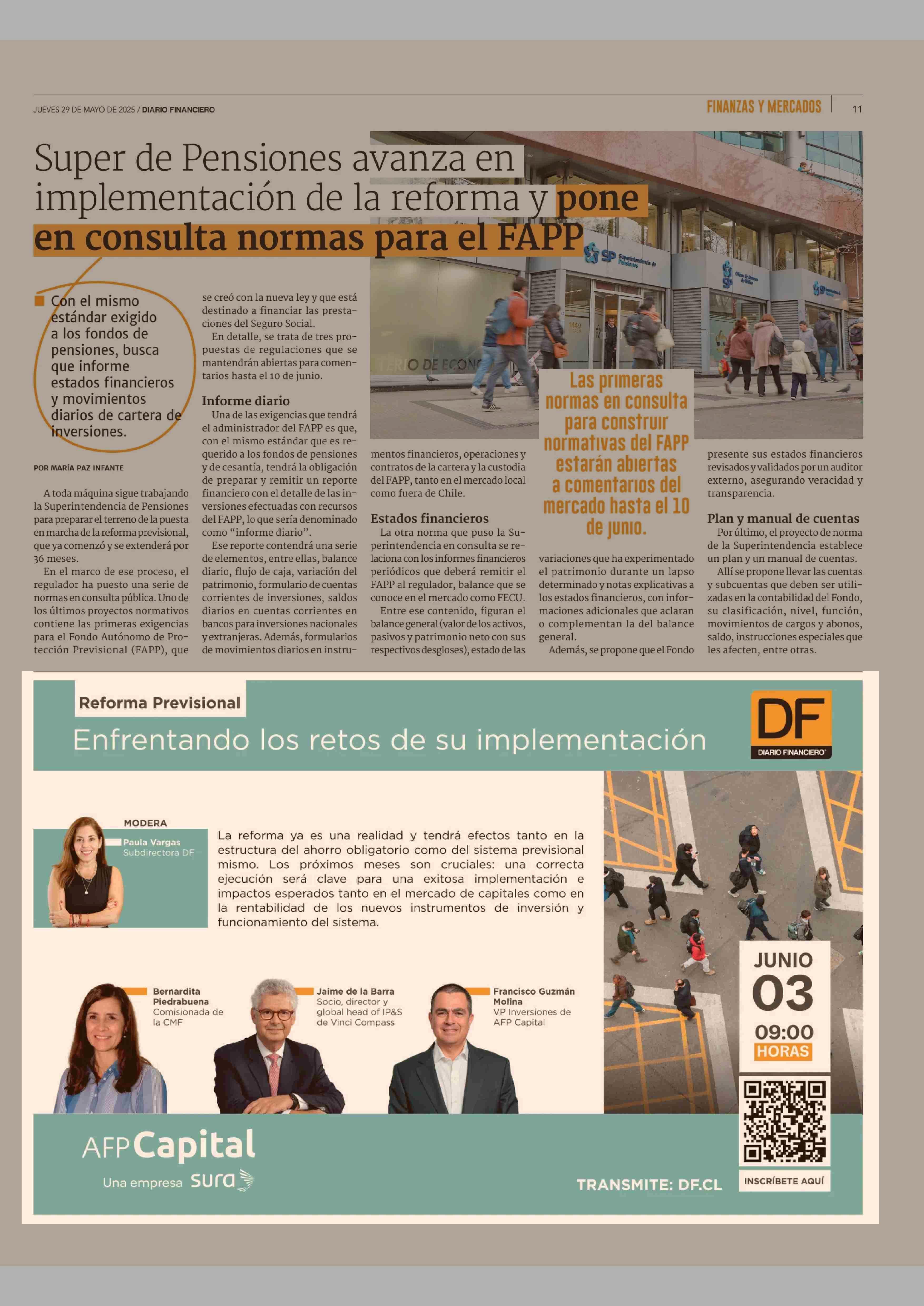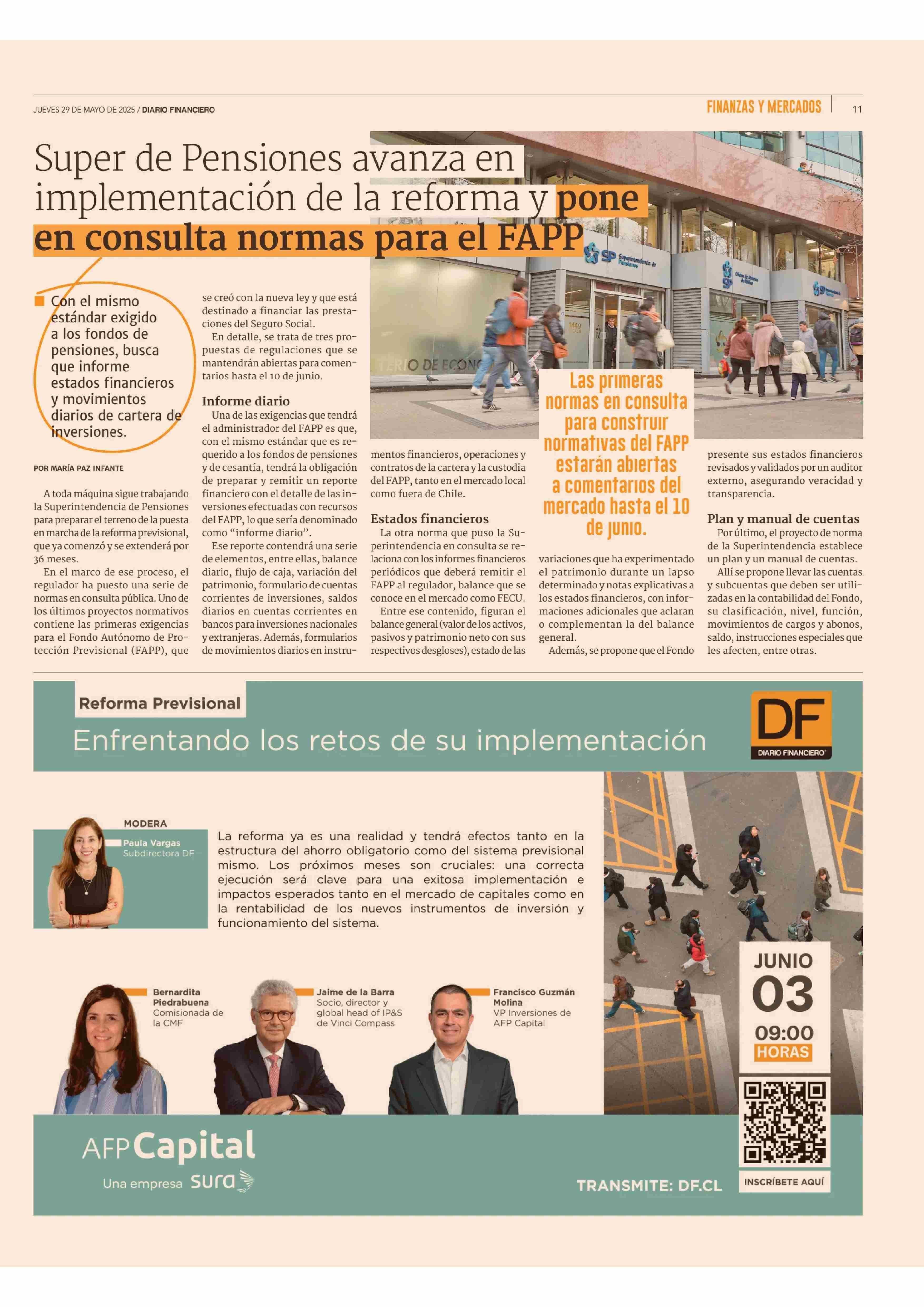 AVISO EVENTOS: Reforma Previsional Previsional Enfrentando los retos de su implementación 29-05-2025 Diario Financiero |