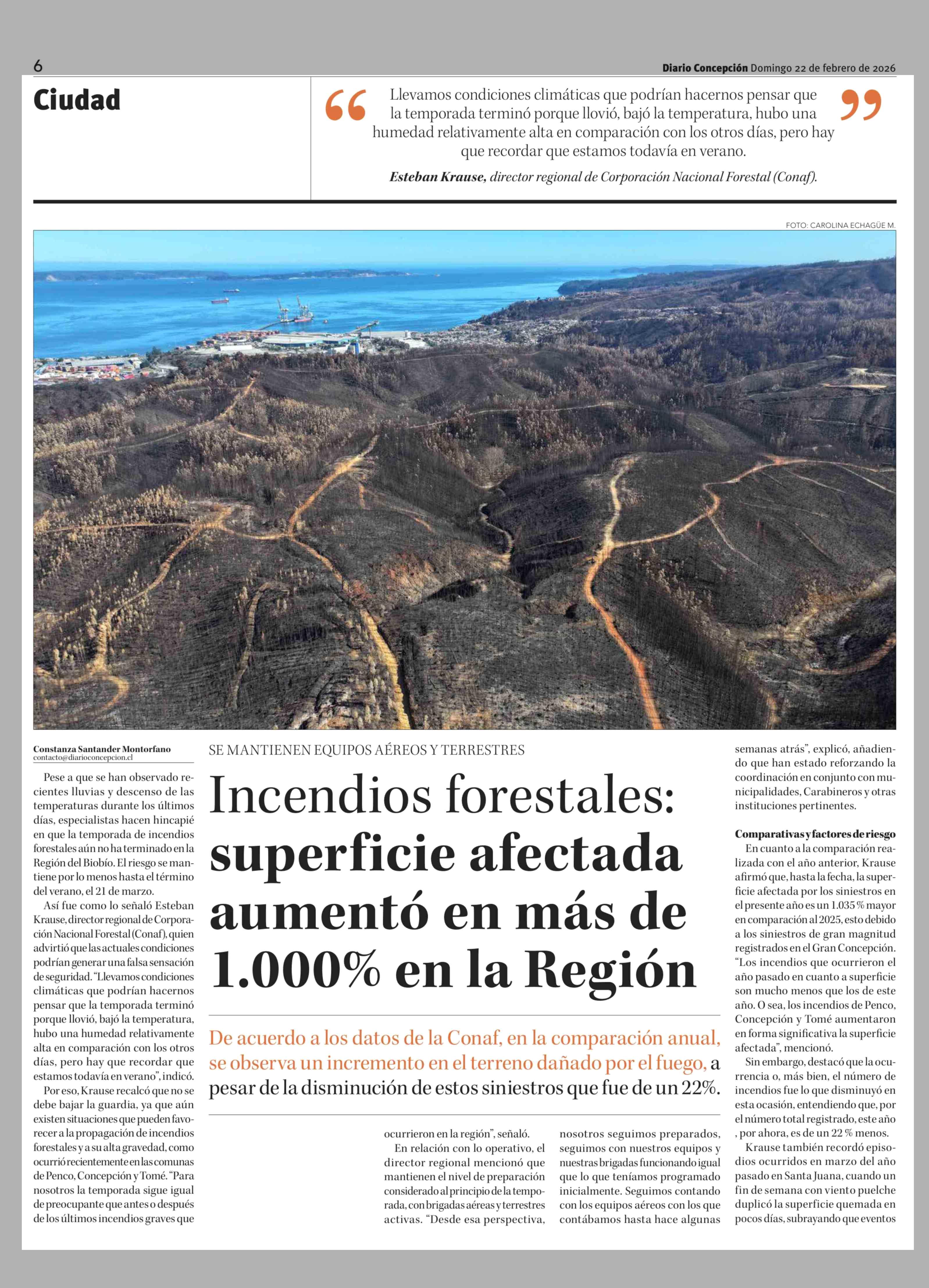 Incendios forestales: superficie afectada aumentó en más de 1.000% en la Región 22-02-2026 Diario Concepción |