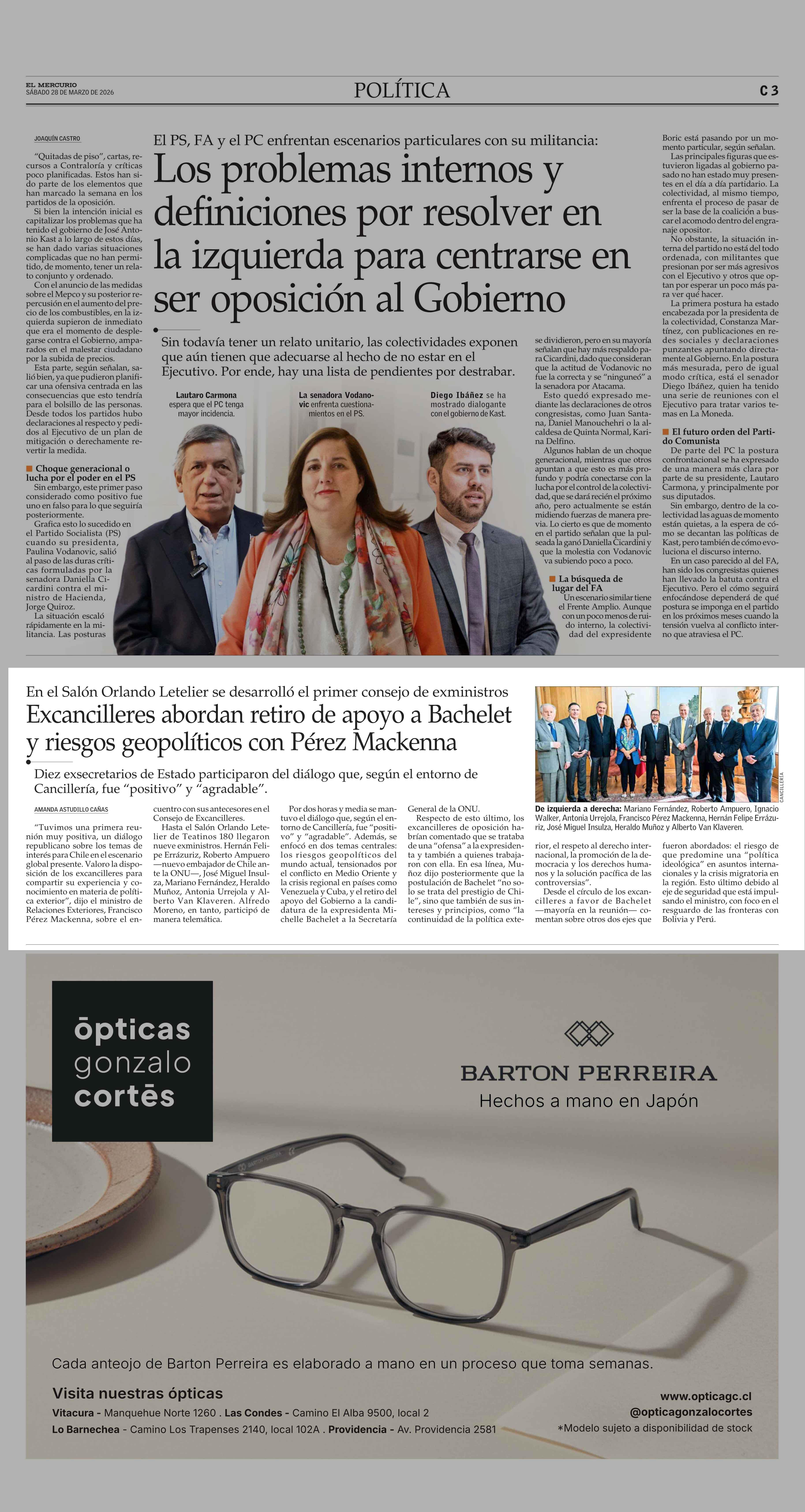 Excancilleres abordan retiro de apoyo a Bachelet y riesgos geopolíticos con Pérez Mackenna 28-03-2026 El Mercurio |